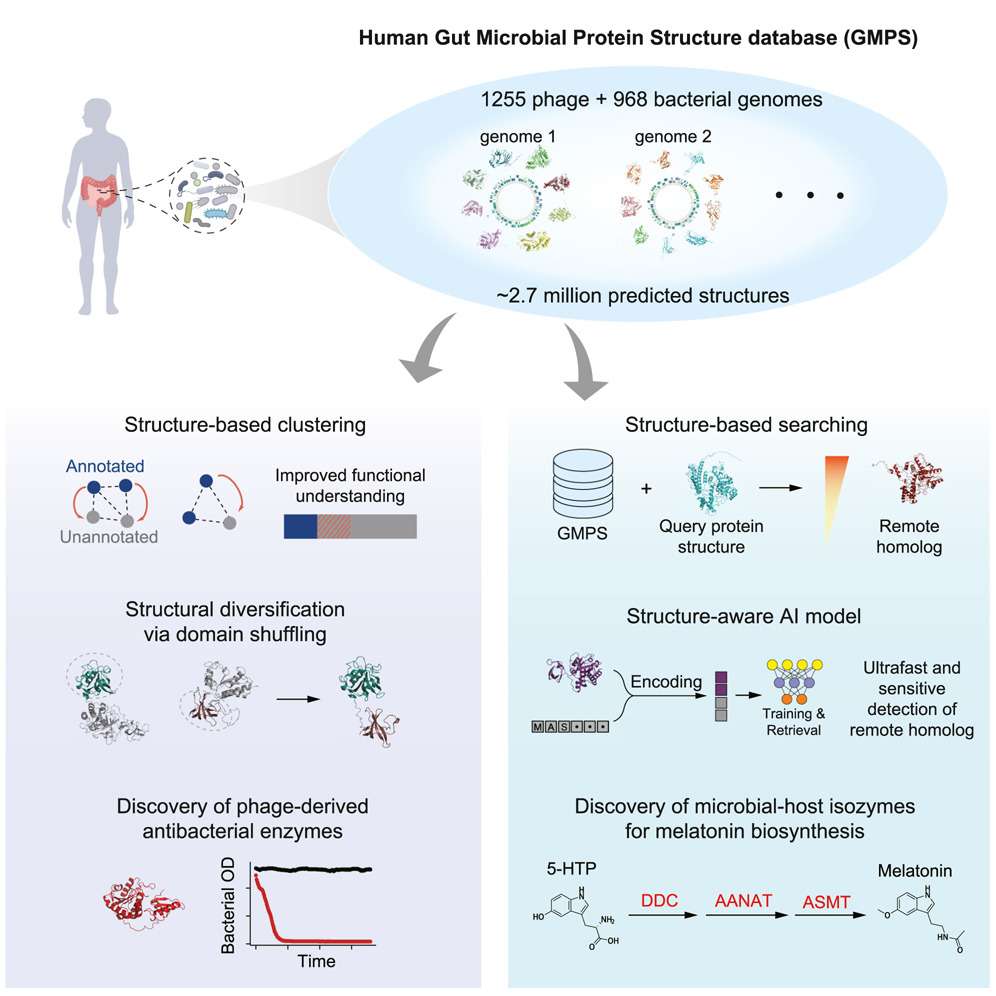 该研究建立了人体肠道微生物的蛋白质结构组数据库和结构检索方法,显著提高了对噬菌体蛋白、菌源宿主同工酶等功能暗物质的预测能力。基于这一方法,研究团队成功验证了肠道致病菌的噬菌体裂解酶,并首次揭示了肠道细菌的褪黑素合成途径。