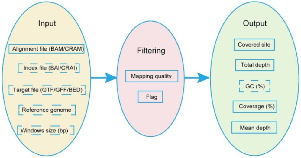 支持排序或未排序的 BAM 和 CRAM 格式对齐文件,并接受 GTF、GFF 和 BED 格式或特定窗口大小的配置文件。