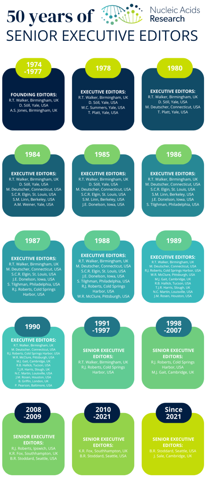 1974年,伯明翰大学的 Richard T. Walker、A. Stanley Jones 与耶鲁大学的 Dieter Söll 三位远见编辑创办 Nucleic Acids Research,旨在打破学科壁垒、汇聚核酸及相关领域的研究成果;半个世纪后,NAR 已成长为生命科学顶级期刊,持续引领并见证学科创新。