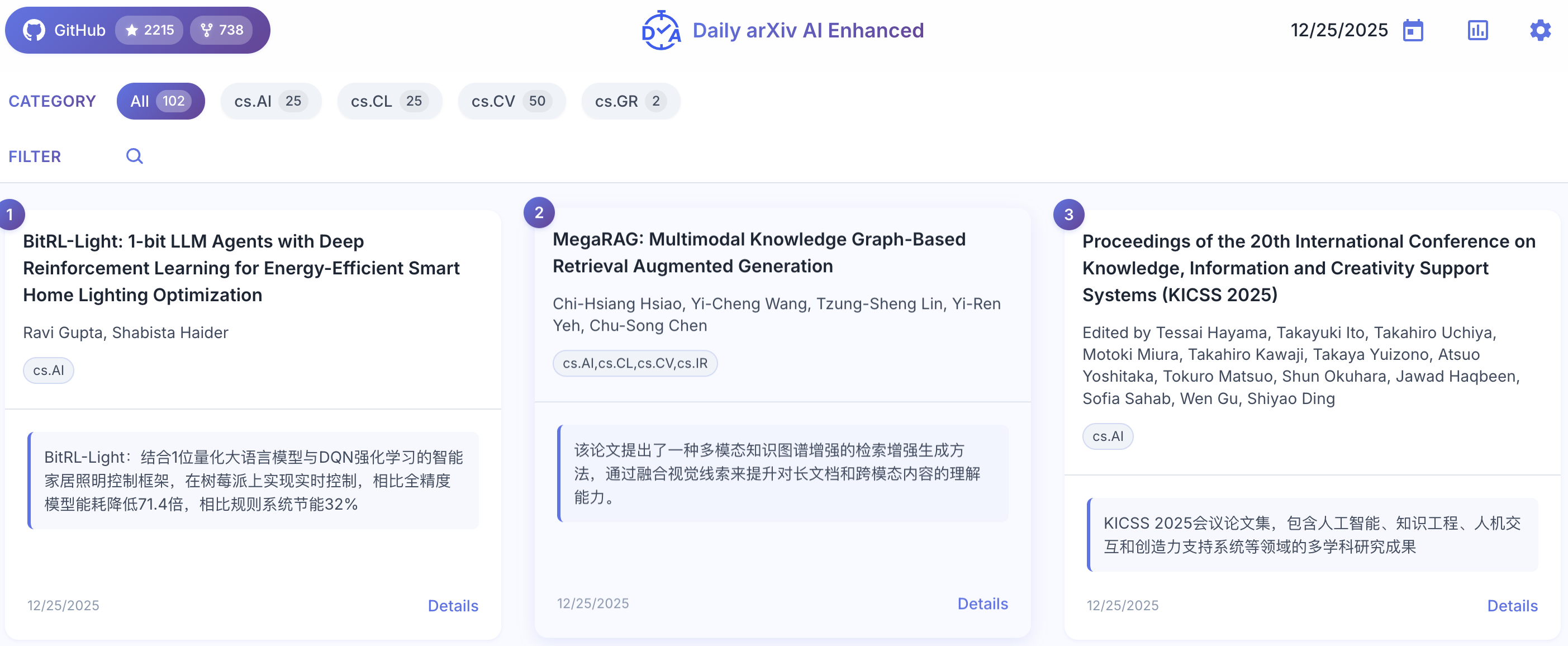 该工具实现了自动化工作流:每日抓取arXiv上的新论文,使用人工智能模型对其生成摘要,并将结果部署到GitHub Pages上完成可视化呈现。