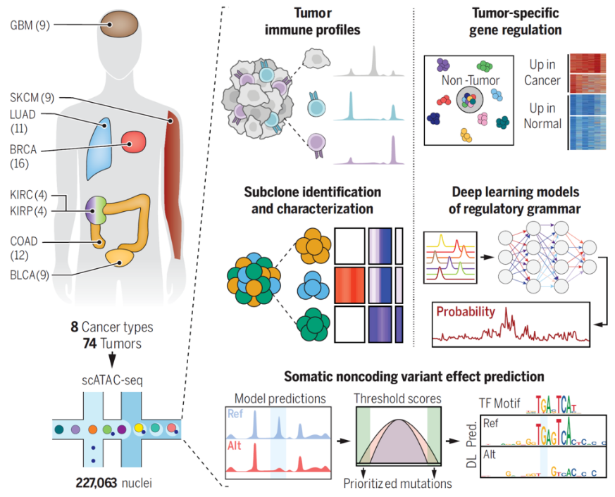 该研究利用TCGA样本构建了跨8种癌症、22.7万细胞核的单细胞染色质可及性图谱,区分出癌细胞与微环境细胞,并训练可解释深度学习模型,揭示癌症特异性调控语法、亚克隆差异及非编码突变对染色质可及性的功能性影响,为解析人类原发癌恶性表型的分子程序提供新资源。 - 论文链接:https://www.science.org/doi/10.1126/science.adk9217