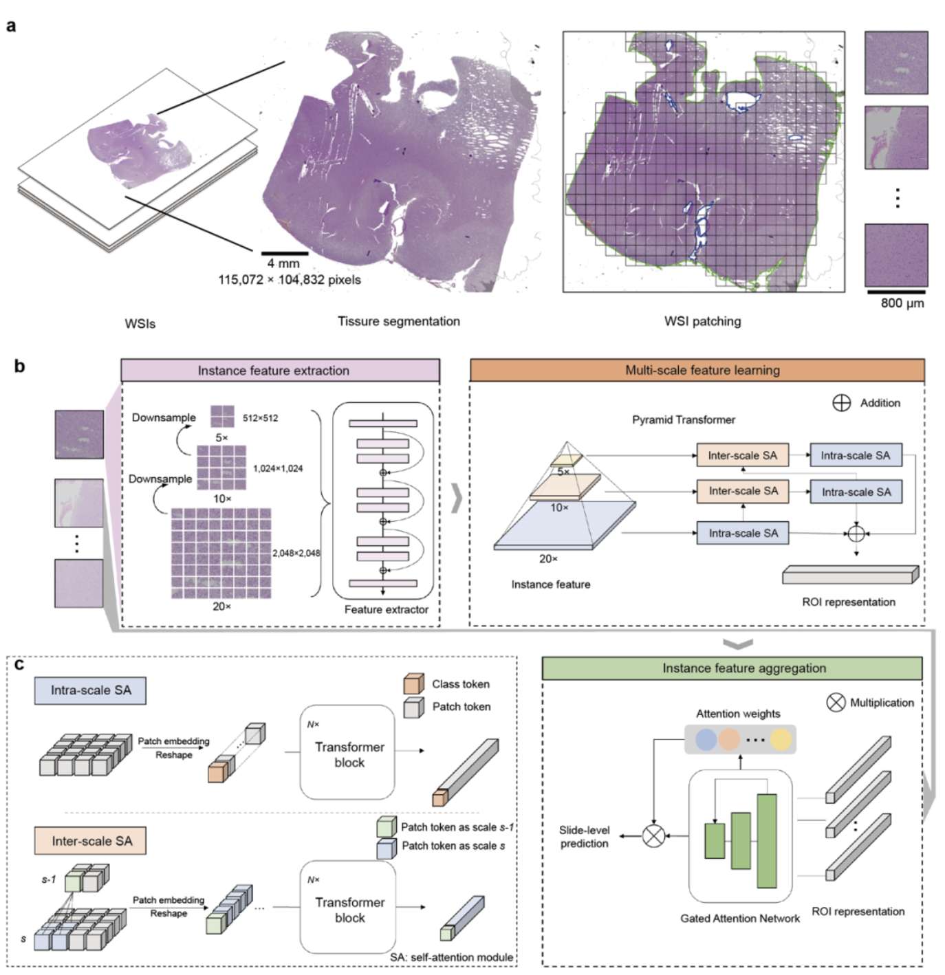 清华大学等研究团队提出了一种名为ROAM的弱监督计算病理学AI基础模型。该模型通过采用大尺寸组织图像块作为分析单元,并利用金字塔Transformer架构系统学习尺度内及尺度间的相关性特征,从而高效提取百亿像素级全切片病理图像的多尺度视觉表征。ROAM在胶质瘤的肿瘤检测、亚型分类、分级和分子特征(如IDH突变)预测等多种诊断任务上实现了临床级的高性能与良好泛化能力,其提供的可视化依据不仅能辅助病理医生提升诊断准确性,还有助于发现与分子特征相关的形态学标志物。