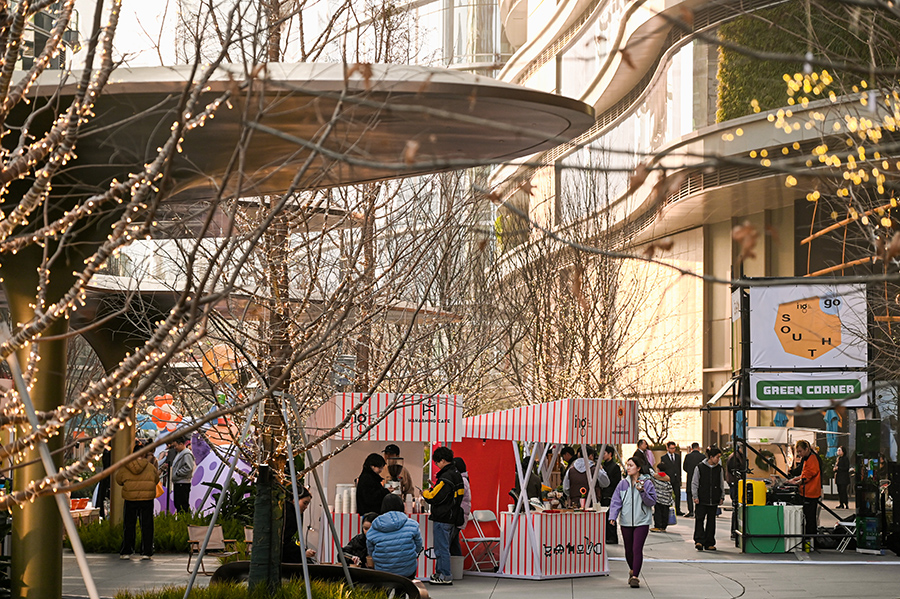 整个项目筹备规划历时两年,最终呈现出了一个低密度、漫步式、与自然对话的环境,这里有草坪有绿植,有立体化的垂直绿化,也有不同装置和区域设计,现场打造了光影广场、萌宠憩园、花岛庭院、核心聚场、雾屿漫游、落瀑广场 6 大全新场景,并通过“浮云间”艺术廊架和开放式的动线,让这里以区别于传统商场的氛围,成为城南白领可以放松的目的地。