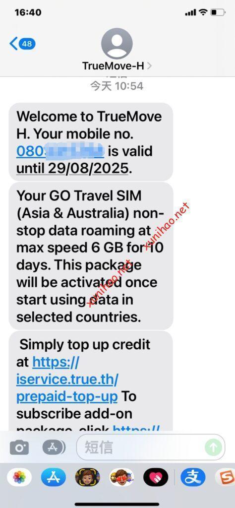 然后收到了泰文短信有电话号码和启用日期以及到期日期。