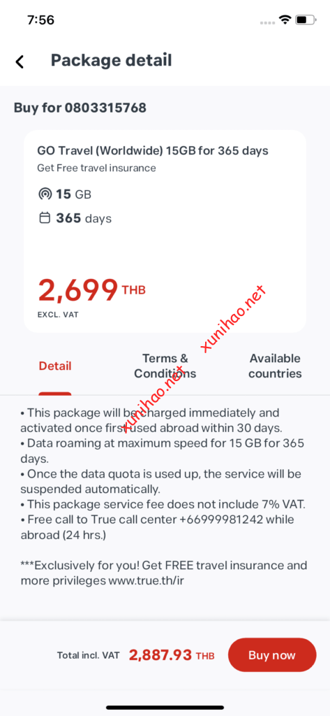 在复购流量包里面有一个2699泰铢全球流量包,里面包含1年15GB流量,可在全球136个国家地区漫游。这个税后2887.93泰铢,折合人民币差不多要650块了。确实不便宜,但是包含的国家较多,都是共用这个流量的。