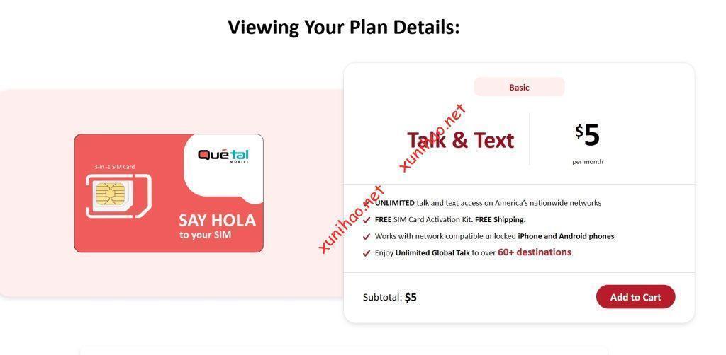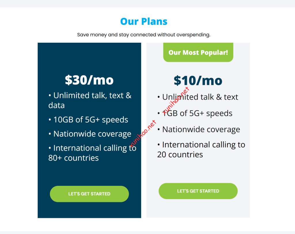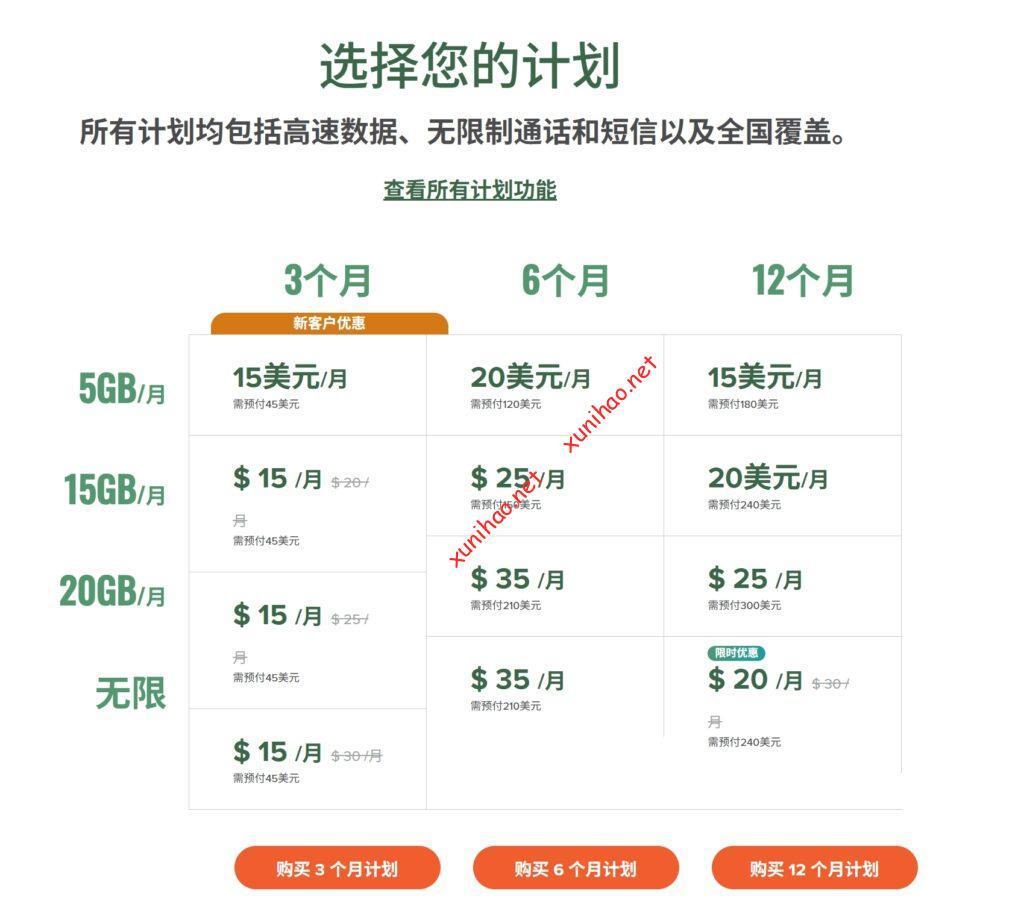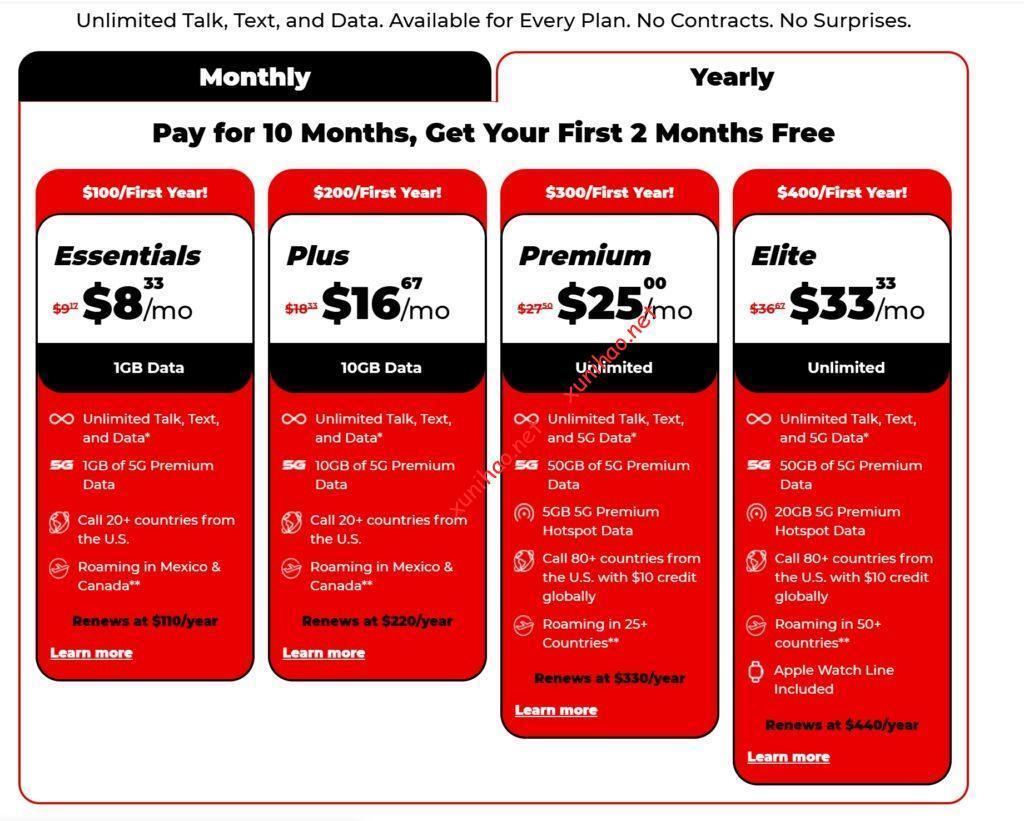 套餐详情:最低月租10美元,1GB移动数据,无限通话和短信,免费wifi calling。