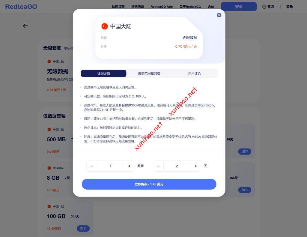 套餐详情:仅用于数据流量,不绑定手机号码,0.7美元一天,没有长期订阅费,用完即止。