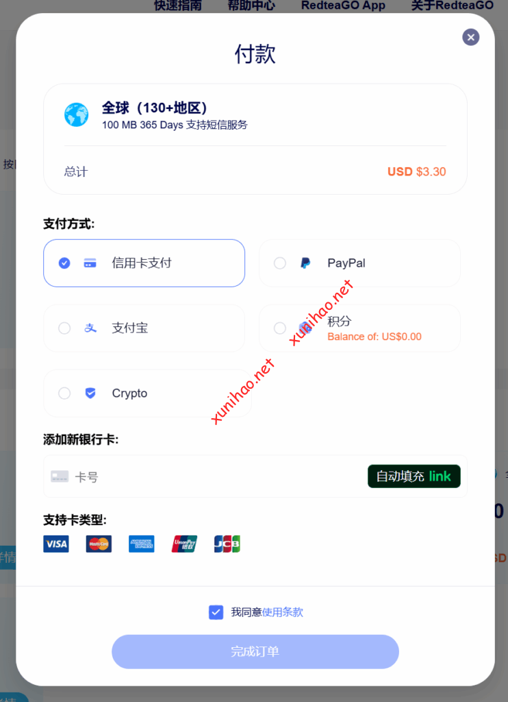 点击付款,选择付款方式,支持visa、master信用卡,还有谷歌支付