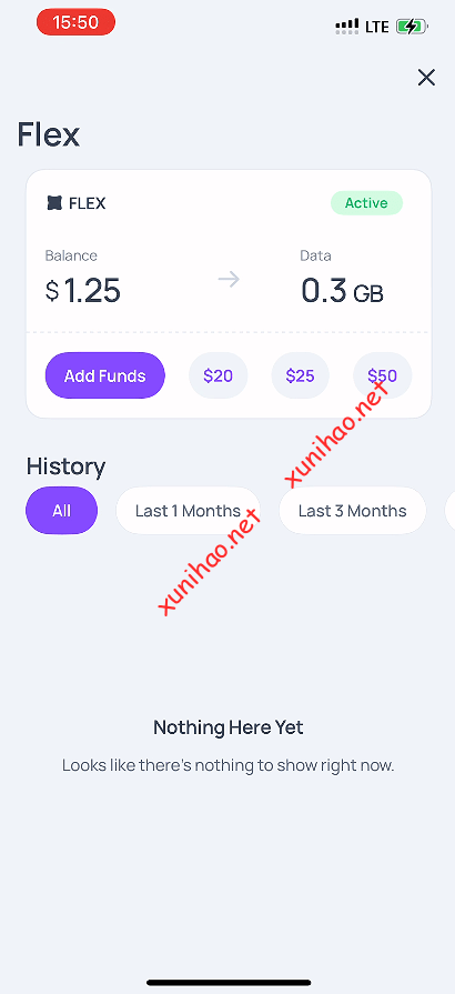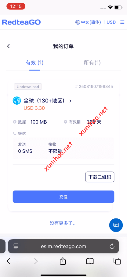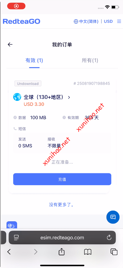 由于领取的3GB流量包不含中国大陆,所以我们能使用的免费流量是首次安装ESIM系统奖励的1.25美金进行PAY AS YOU GO消耗,有效期是30天。实际只能用到300MB就扣完了。再继续用就需要充值了。