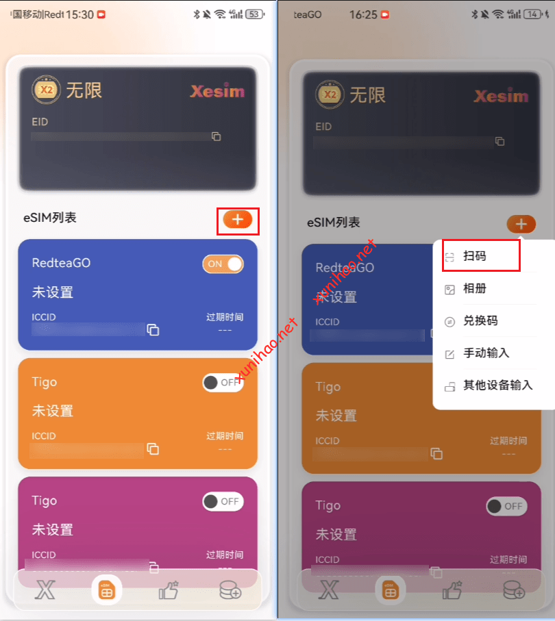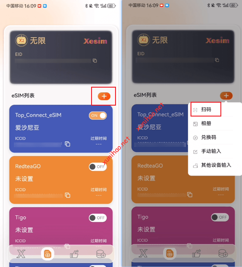 下载Xesim app。点击Xesim app 右上角的+号,点击扫码。