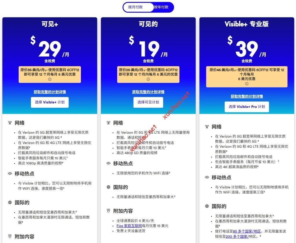 visible+专业版 月租39美金,无限通话短信和数据,漫游多个国家和地区