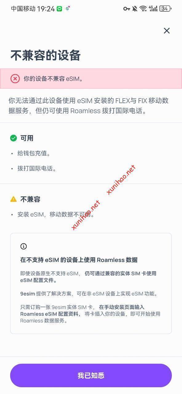 如果你的手机不支持ESIM。你仍然正常安装ROAMLESS APP。APP会直接提示 你的设备不兼容ESIM,但是下方直接写明了你可以使用9ESIM这类实体SIM卡,也就是虚拟号视频里经常提到的ESIM芯片来下载