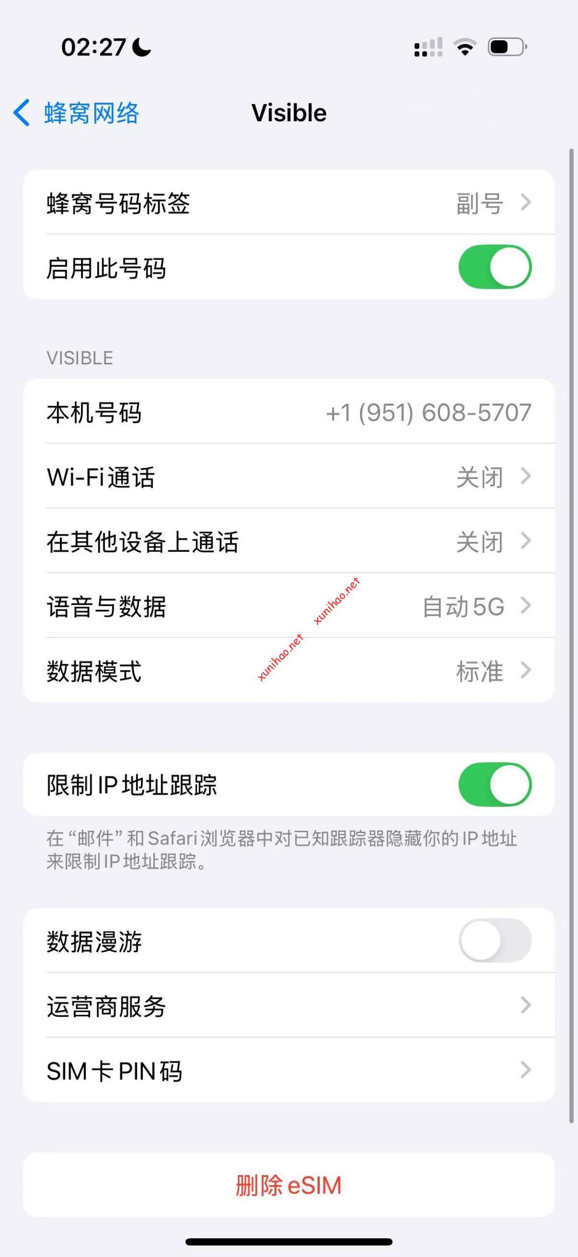 似乎visible的ESIM套餐绑定了一个默认的IMEI设备号,这个设备号既不是美国朋友下载成功的IPHONE ESIM手机设备串号,也不是我上报的美国XR ESIM苹果手机串号。每当我登陆VISIBLE APP时就显示这个IMEI的后6位。