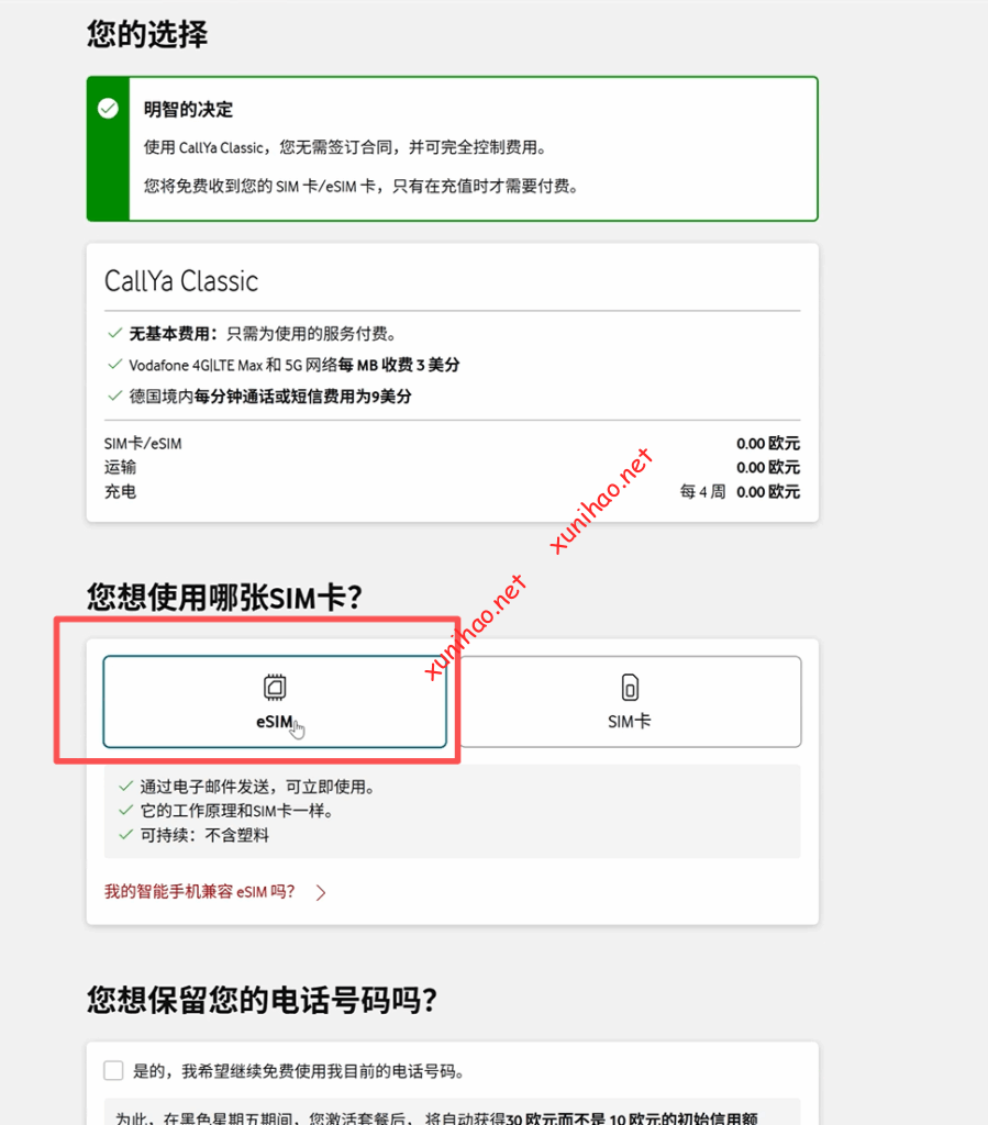 德国vodafone申请eSIM链接:https://www.vodafone.de/freikarten/callya-classic-form/?icmp=prepaid-ohne-vertrag_tile_classic#personal-details-1,选择eSIM