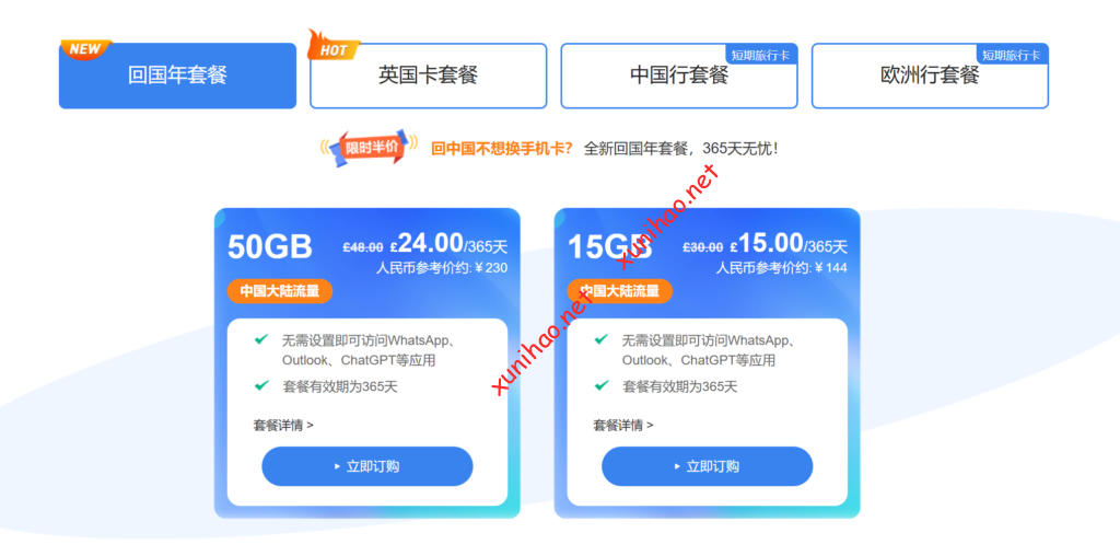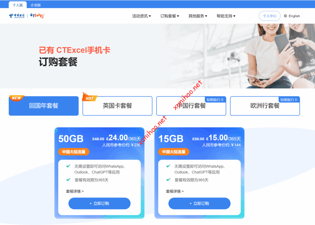 • ctexcel英国卡**回国年套餐:如15GB套餐365天只需£15**(英镑),50GB套餐365天只需£24(英镑),适合回国或暂居中国用户,可保留英国号、收验证码、使用ChatGPT、Ins等,支持eSIM即装即用或实体卡包邮。