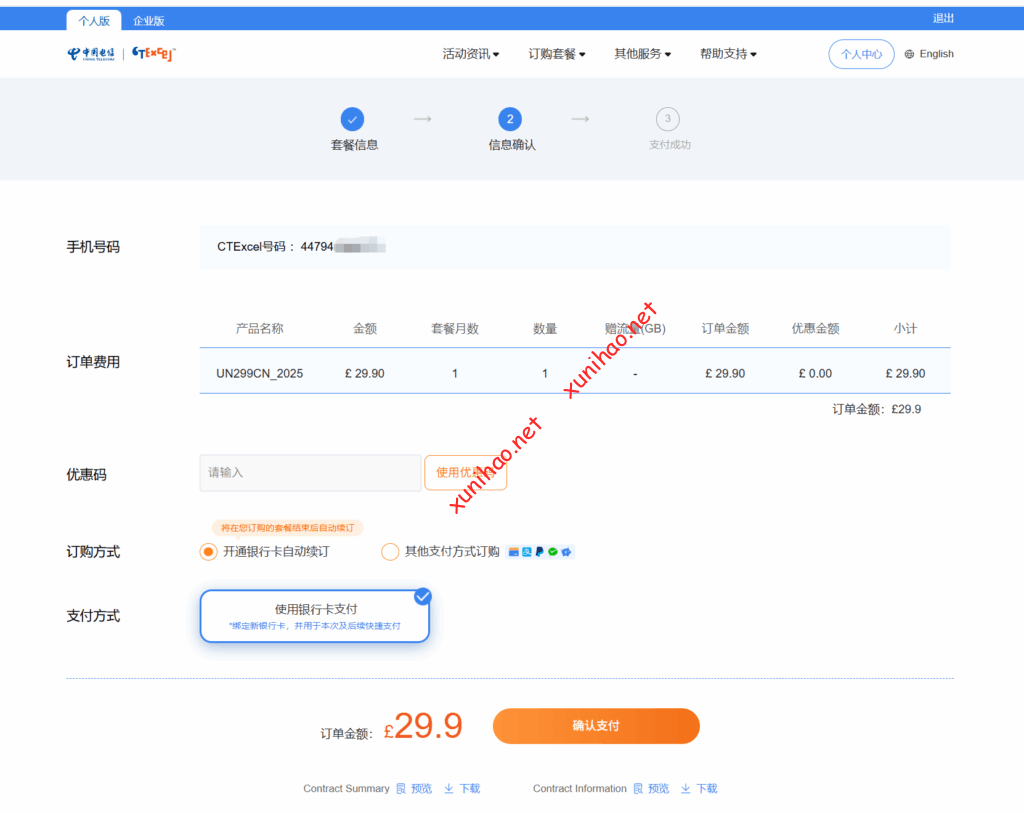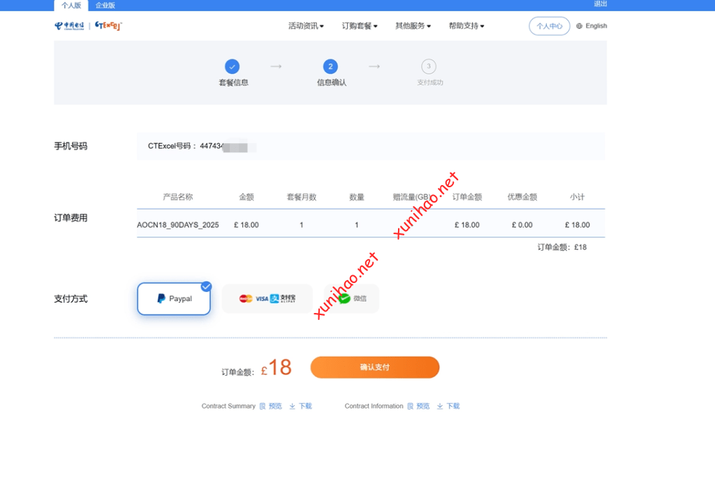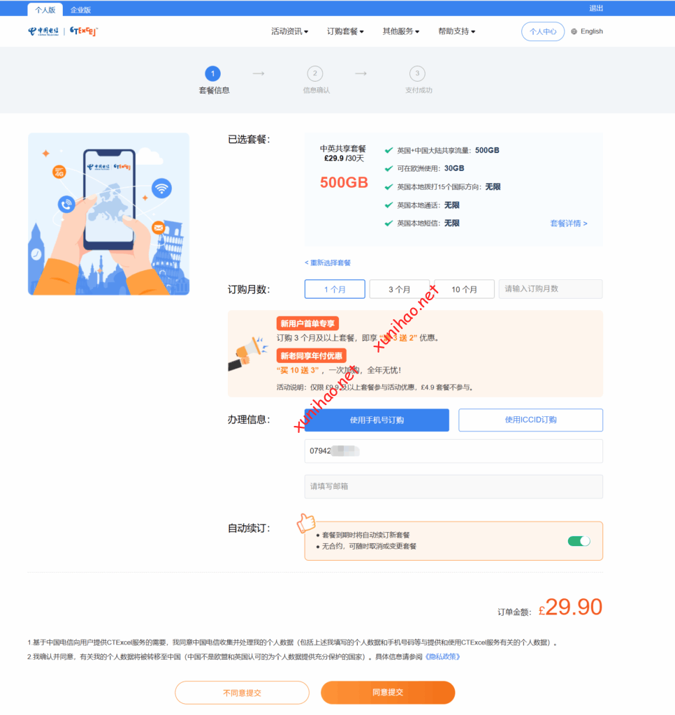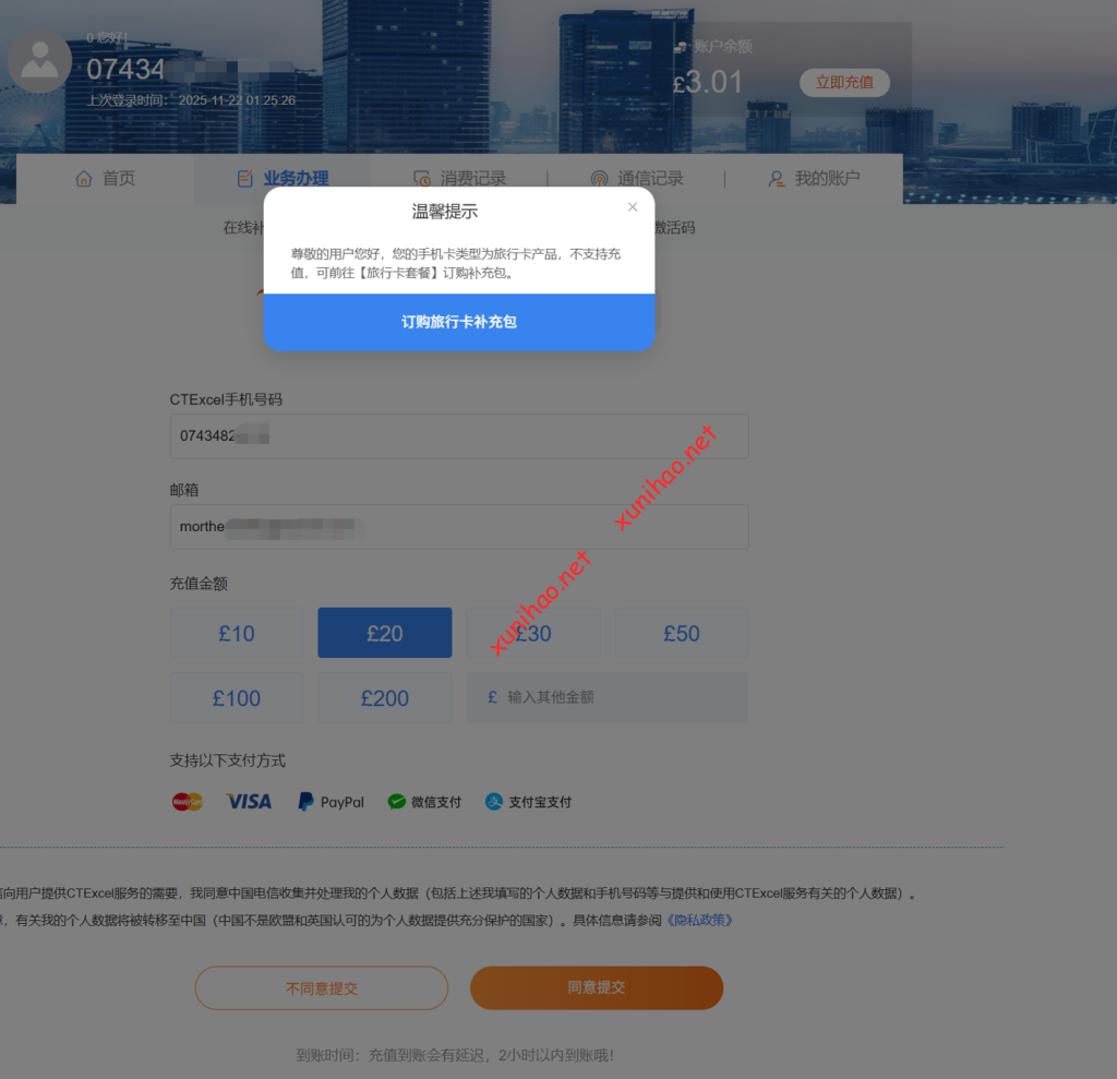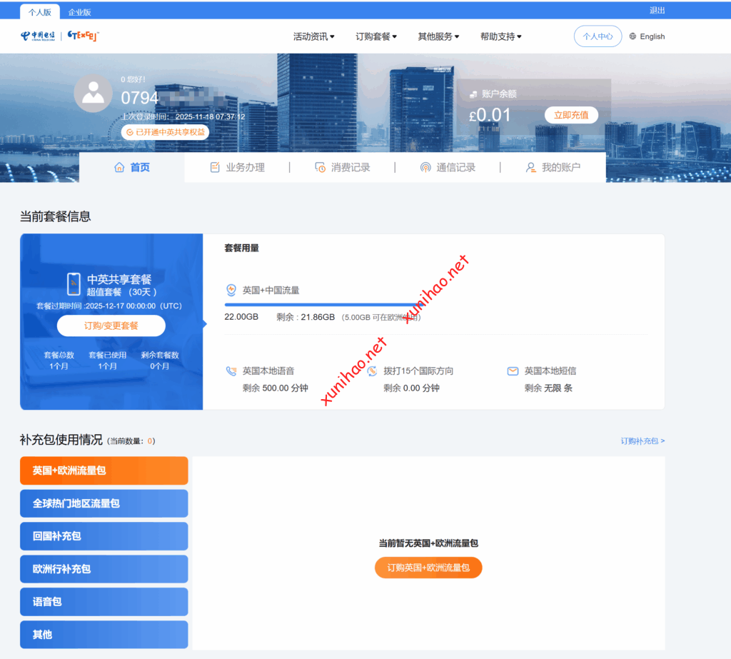 注意 ctexcel旅行卡是虚拟号接触到另一种渠道的中国电信CTEXCEL英国卡,这种卡与上述介绍在英国当地插卡激活的卡不一样,是不能直接充值回国年包套餐的,只能订购旅行卡补充包