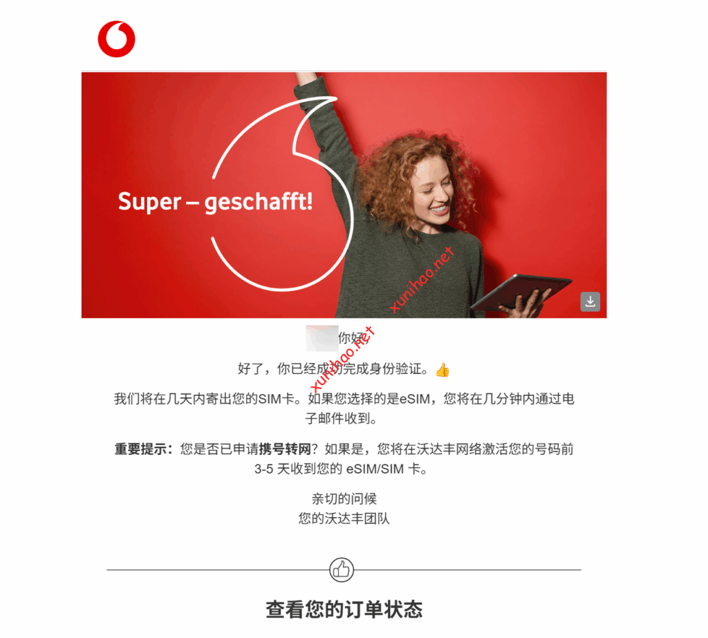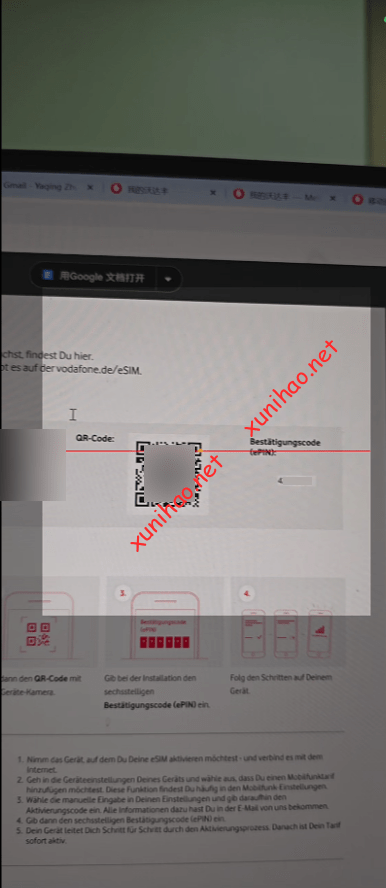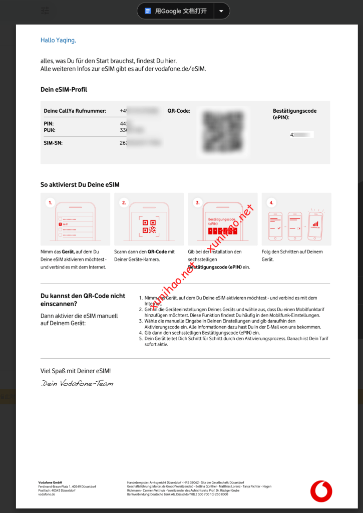 确认后,过了几分钟,德国vodafone发来了eSIM二维码邮件,需要用之前设置的密码打开。上面有eSIM二维码、电话号码、以及PIN码(激活二维码时会用到)。
