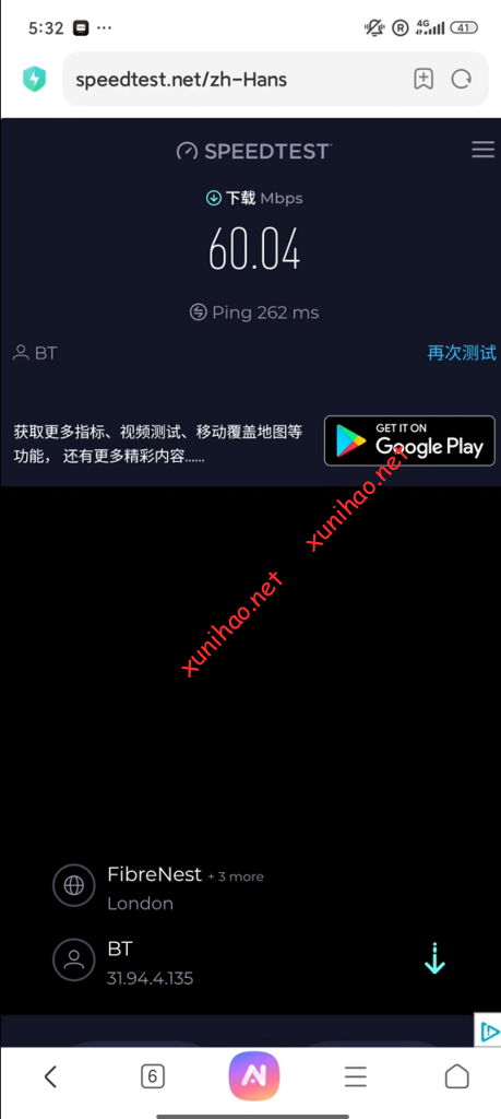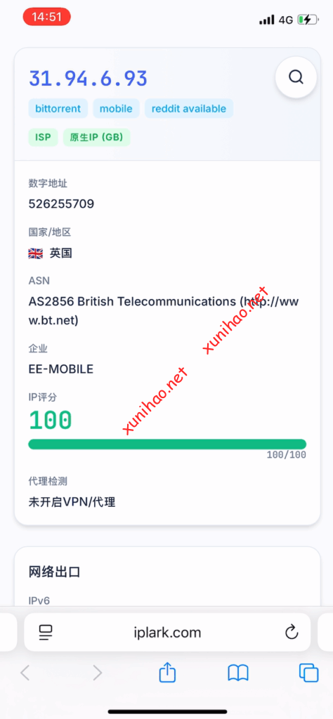 ctexcel的ip是英国原生ip,使用iplark.com检查,可以看到显示的是英国的原生ip,使用的是EE的网络。