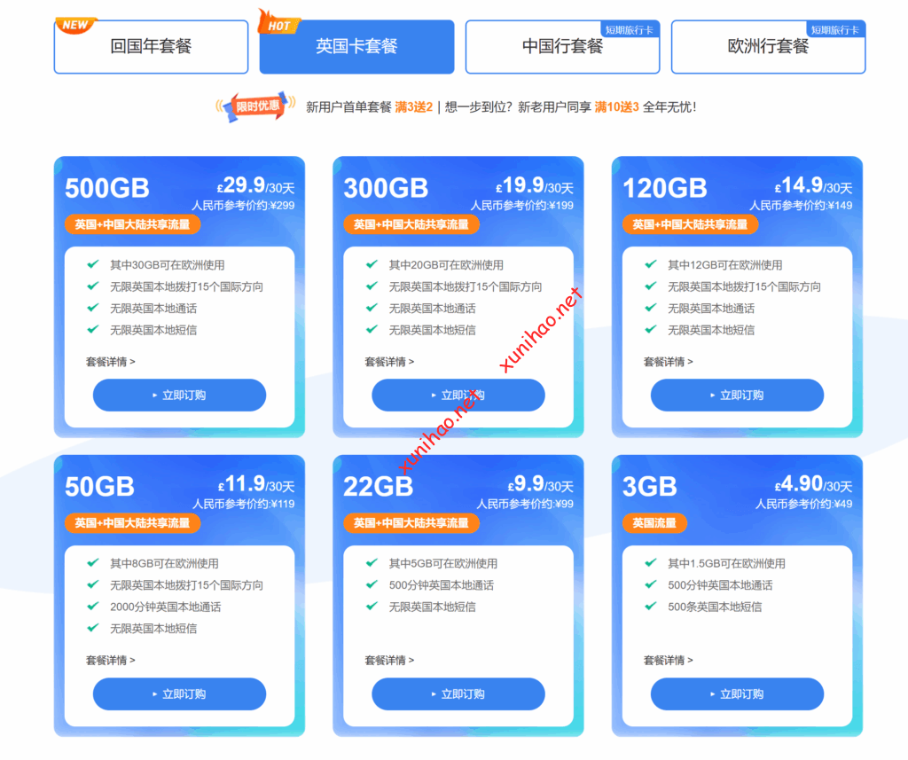 • 3GB英国流量套餐:49元/月(人民币),包含1.5GB欧洲漫游流量,500分钟英国本地通话,500条英国本地短信,适合轻度使用网络,主要以通话和少量短信沟通为主,偶尔使用网络进行简单浏览的用户。