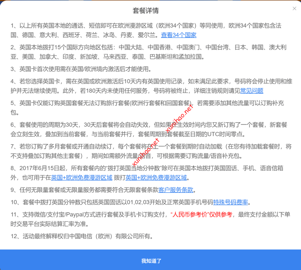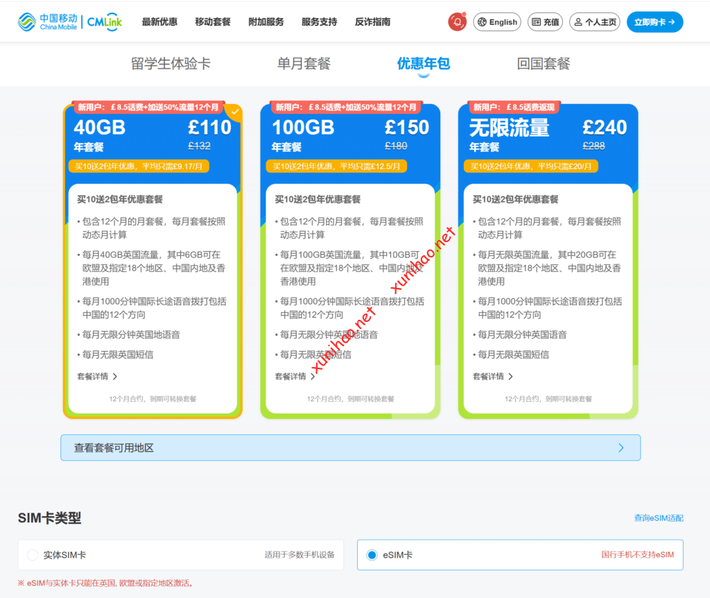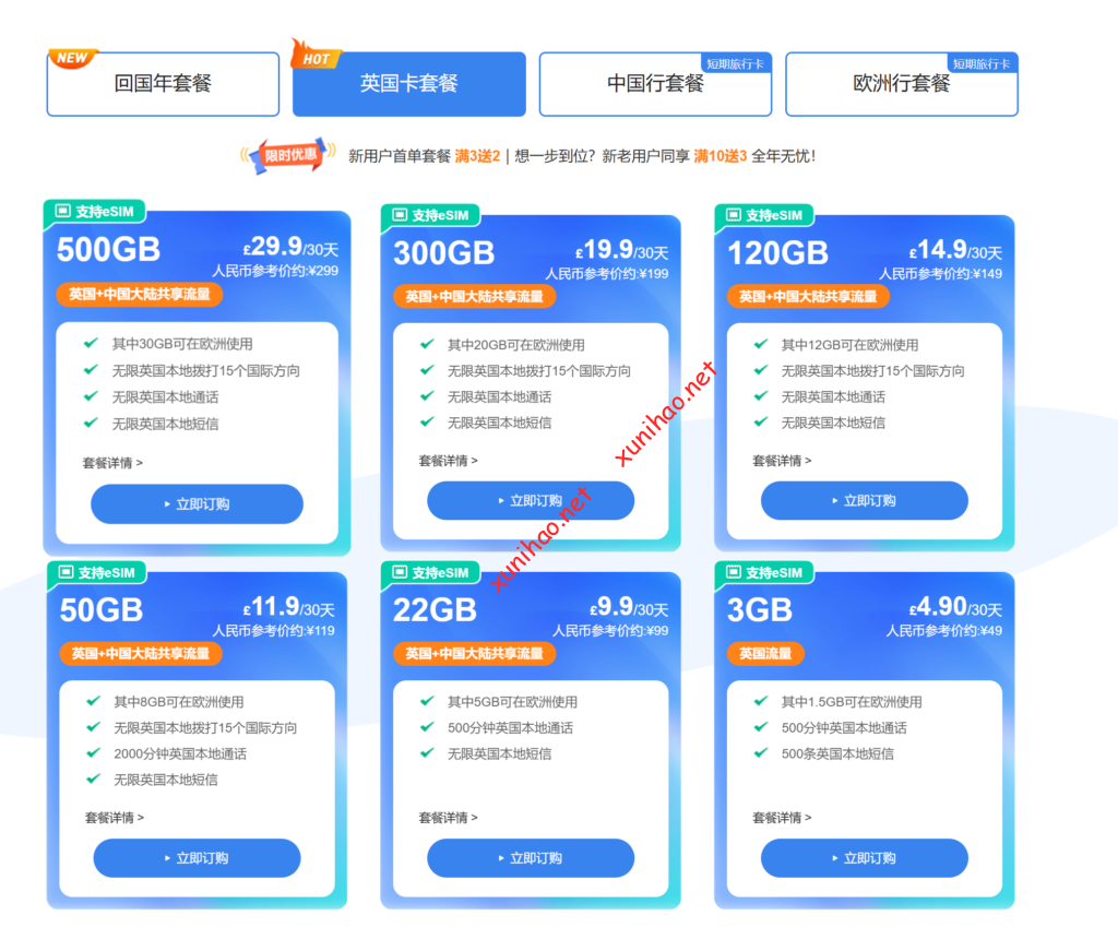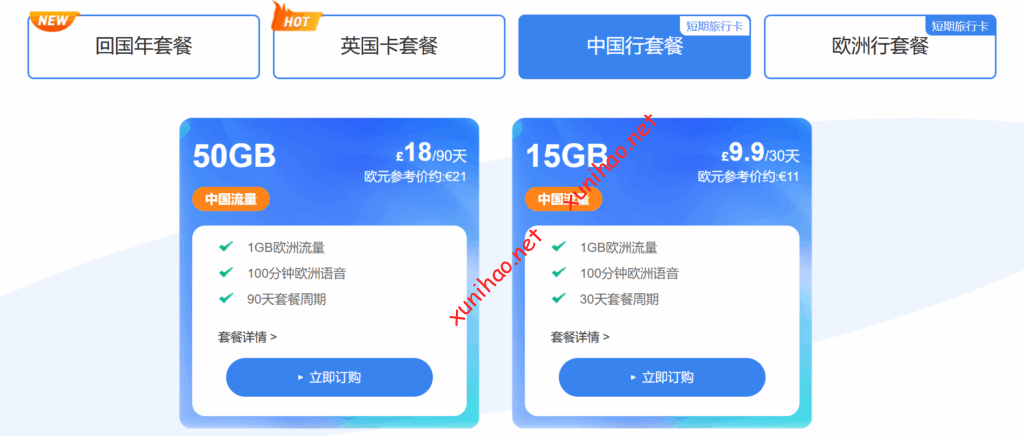 • 120GB中英共享套餐:149元/月(人民币),12GB欧洲流量,适合网络使用较为频繁,经常观看视频、进行视频通话等,且在中英两国都有较多网络使用需求的用户。
