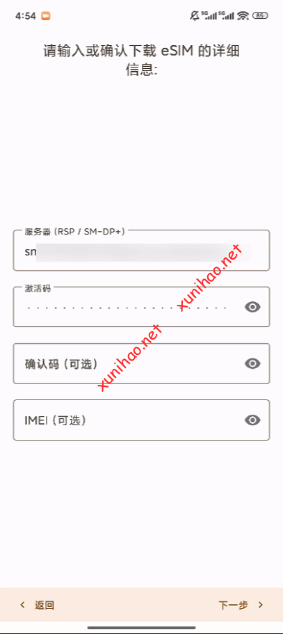 确认eSIM的详细信息,填写PIN码