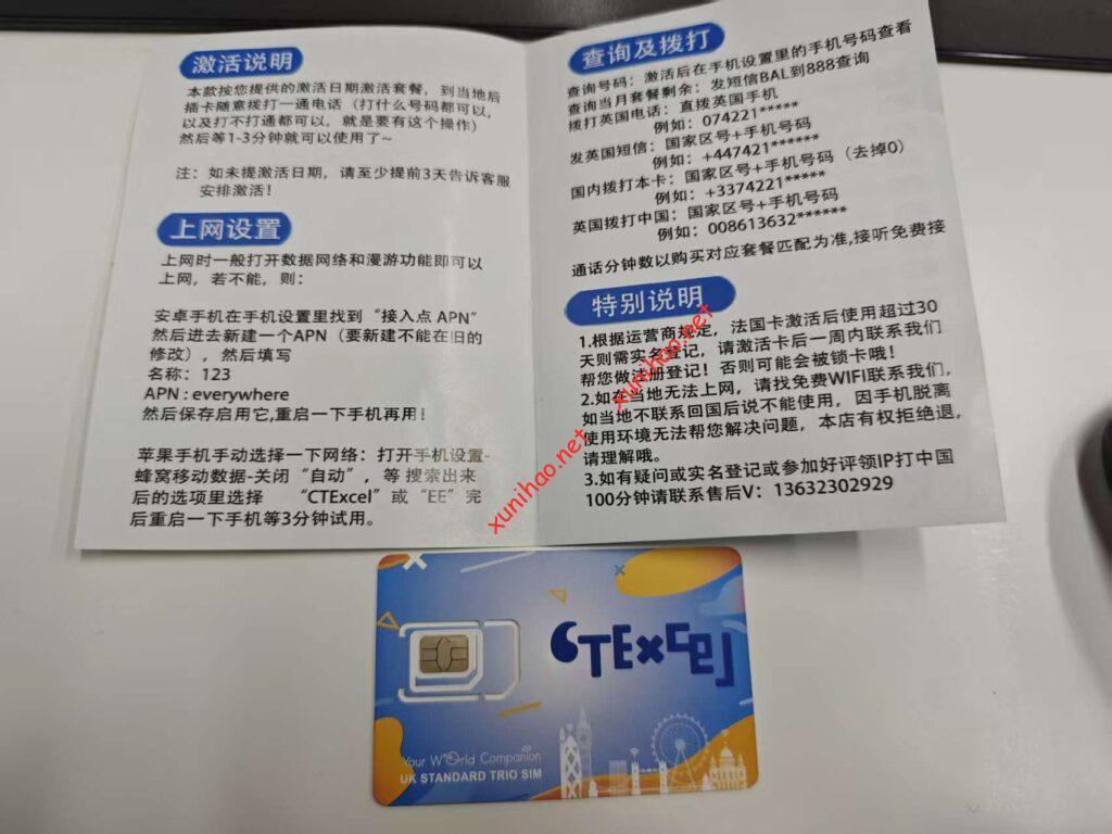 因为收到这张卡时已经是激活好了的,可以直接插卡。如果你的卡收到还没有激活的,有网友说可以连接英国的IP地址,可以通过使用魔法上网或代理服务器来获取,再将CTExcel UK SIM卡插入手机,开启WiFi Calling功能来激活ctexcel。