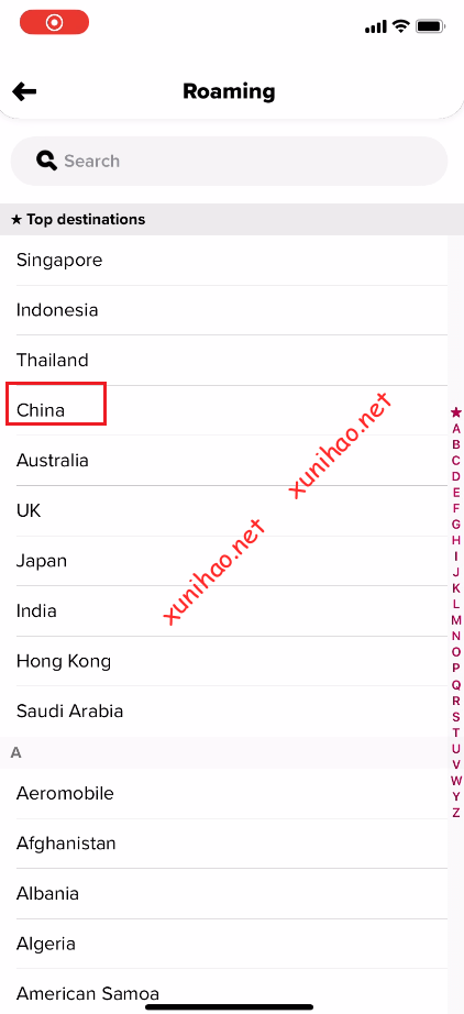 现在我们可以开通一个漫游包进行上网,点进主页的Roaming,选择“china”