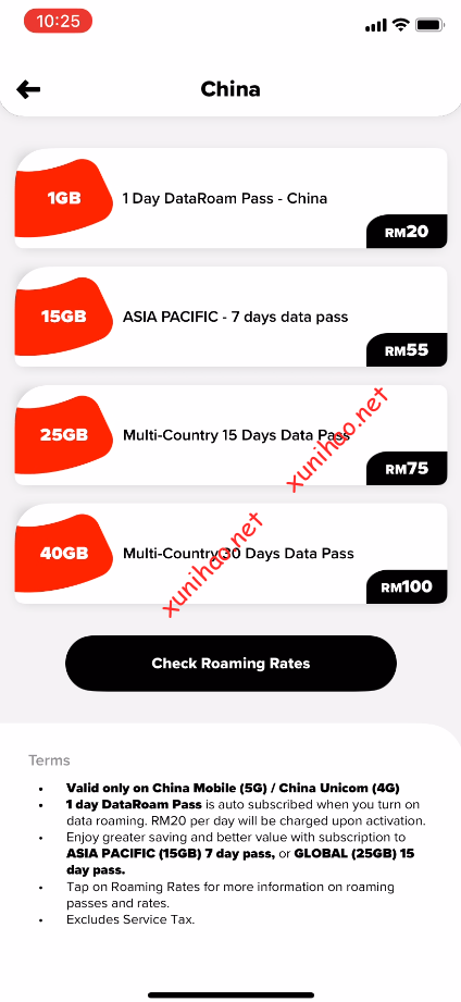 可以看到不同套餐的漫游包,里面比较划算的是30天 RM100 40GB的套餐