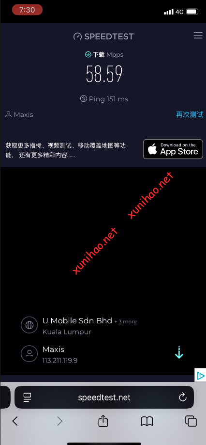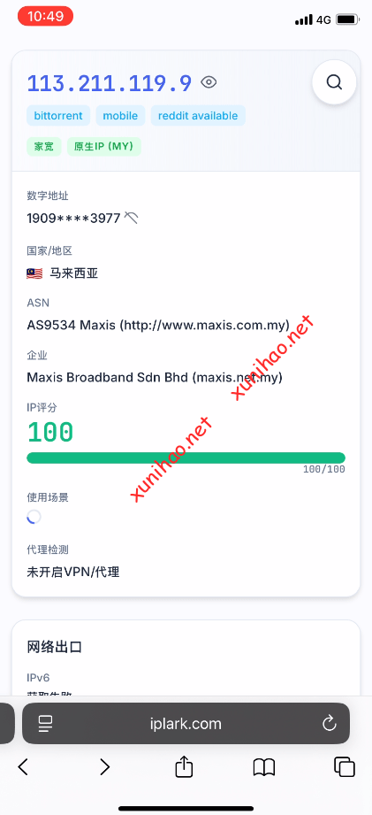 测试一下hotlink的ip地址,点击plark.com网址,可以看到地址是马来西亚的,使用的是Maxis的运营商网络