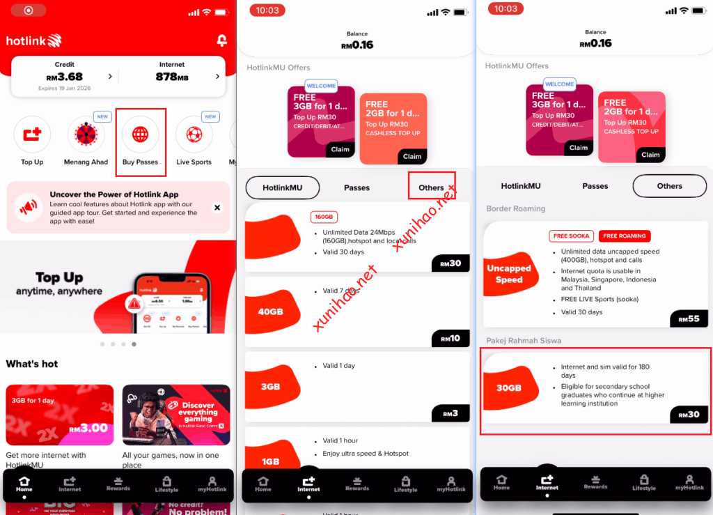 点击APP主页的“buy passes”,选择others ,下方有一个180 天有效期30GB流量30RM的套餐。