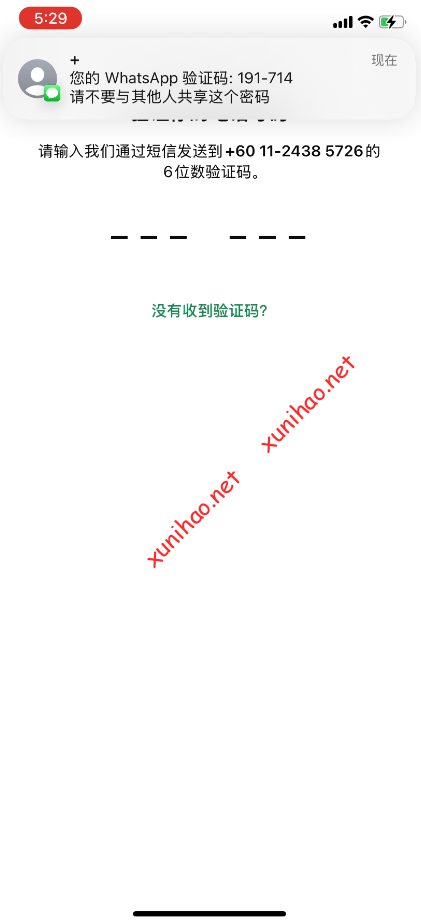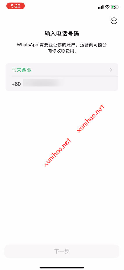 打开WhatsApp,填写注册电话号码,地区选择马来西亚