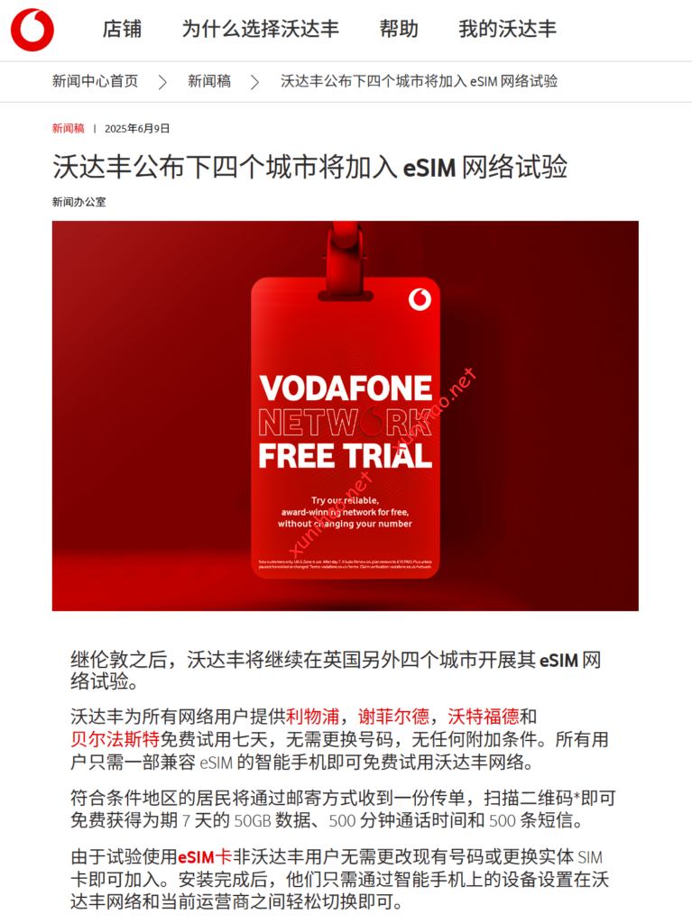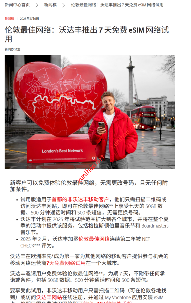 考虑到上面沃达丰esim的成本太高,虚拟号又在沃达丰官网的新闻网页面发现在五月份发布了推出7天免费esim网络试用,但是虚拟号现在申请试用时,发现试用已经结束。https://www.vodafone.co.uk/newscentre/press-release/esim-london-free-network-trial/?utm_source=chatgpt.com