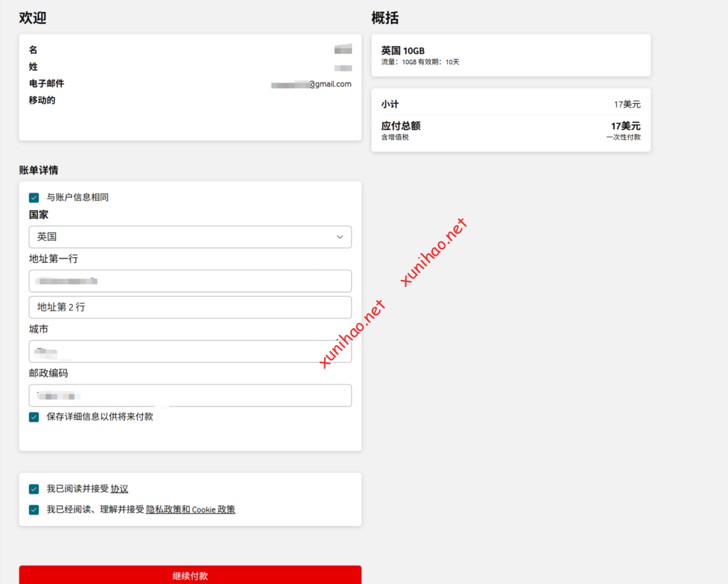 填写账单详情,同意协议政策。