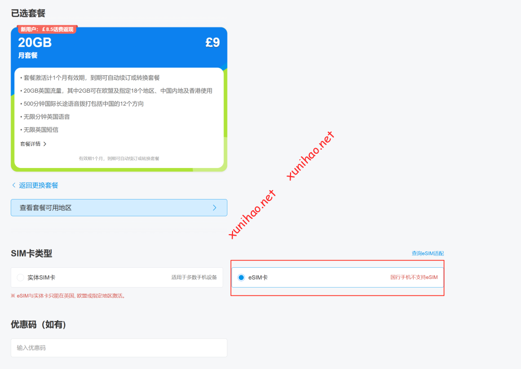 购买流程:选择先要的套餐,在SIM卡类型里直接选择esim(目前官网在购买时没有直接的esim选项了)
