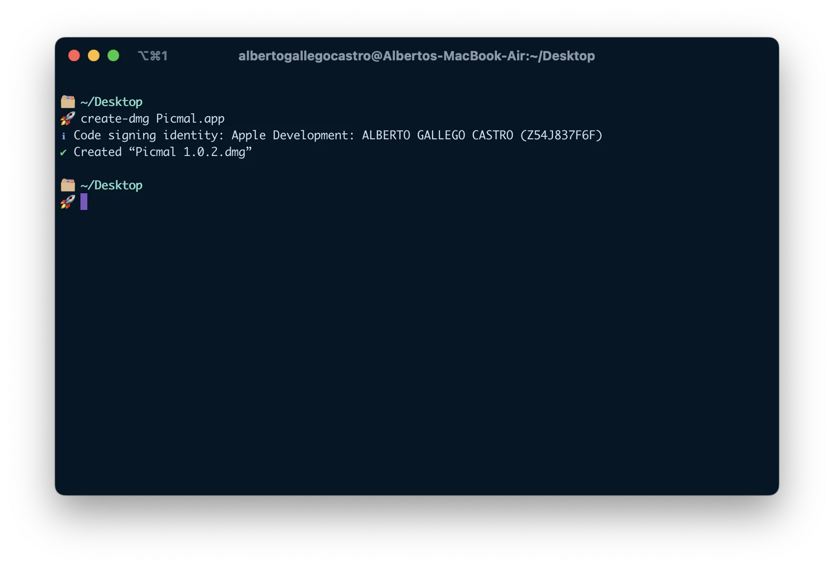 .app file.To give users a better experience in order to install the app, I used create-dmg, a simple CLI tool that outputs a polished DMG file.