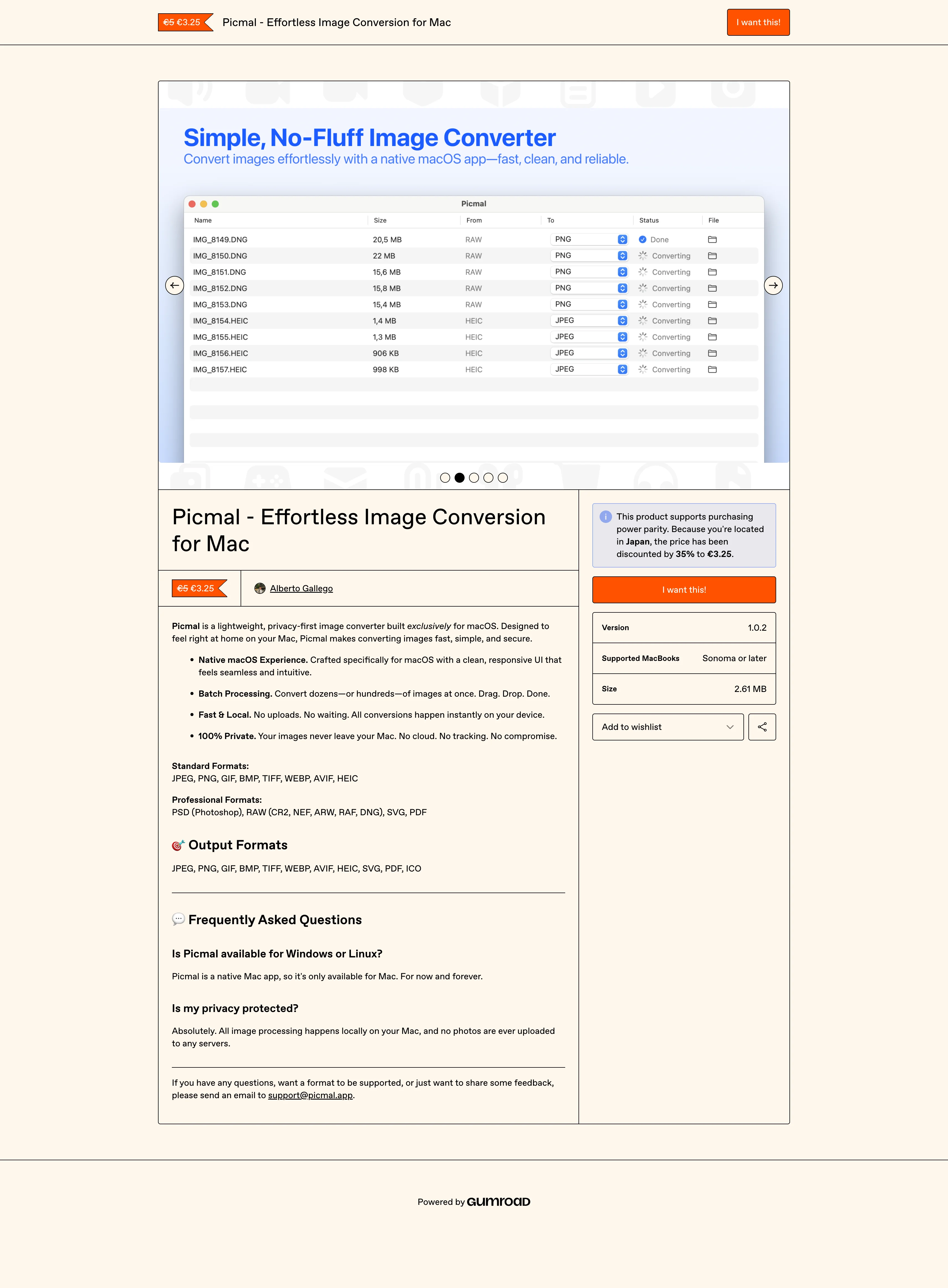 If you see something like this message, you’re done. You can upload your DMG to Gumroad (or wherever you prefer) and start selling. Here is how it looks my app in Gumroad: