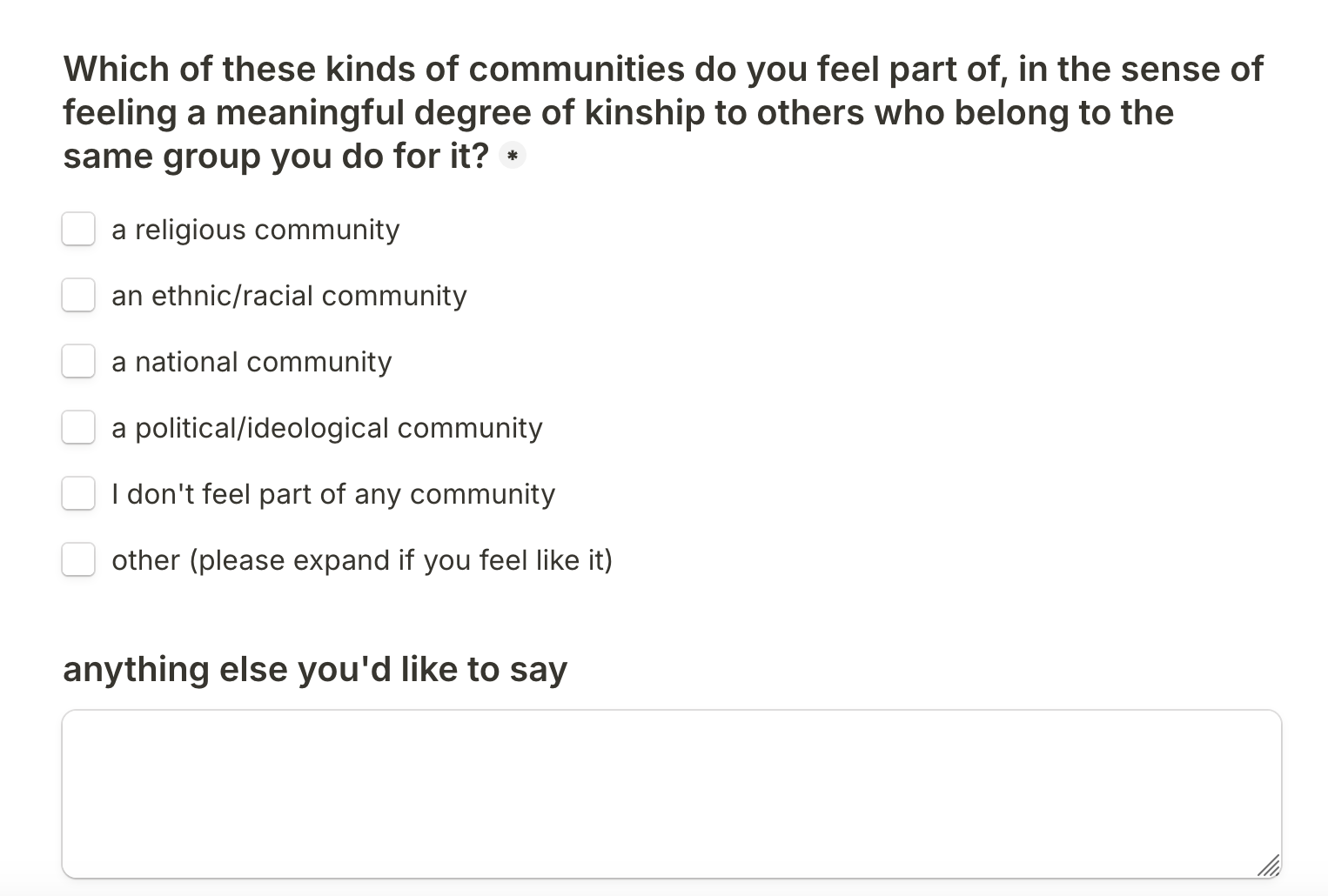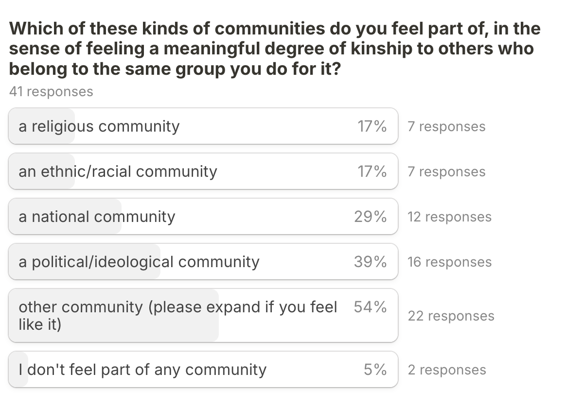 Anyhow. I don't actually have a thesis, but I can at least bring you the results of my survey; here's the types of communities ATVBT readers [^4] feel meaningfully a part of: