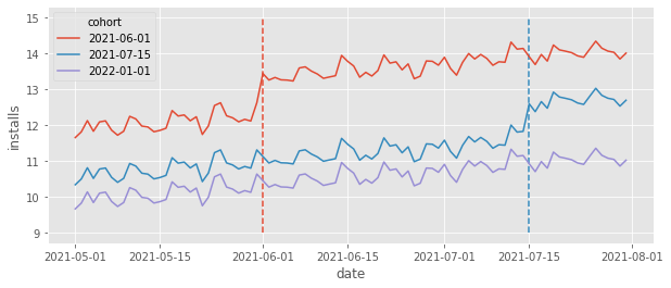 更进一步地思考,干预前的日期效应是可以忽略的,对照组的日期效应也是可以忽略的;因此可以对 TWFE 的函数形式进一步简化,来减少需要处理的参数量: $$ Installs_{it} = \sum_{G=q}^g \sum_{t=g}^T \tau_{gt} D_{it} + \gamma_i + \theta_t + e_{it} $$