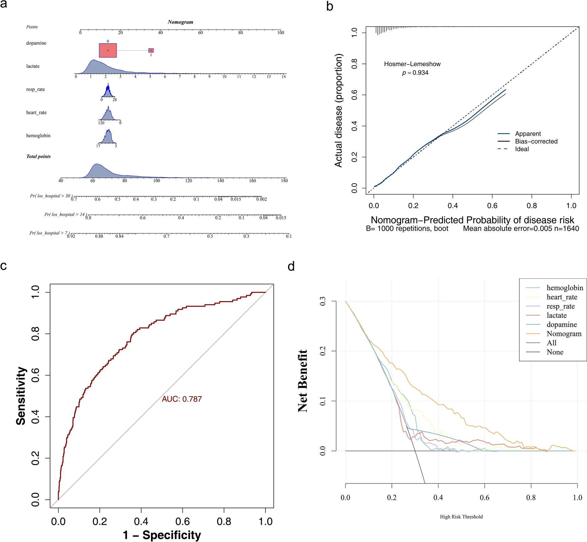 主要结论:在同时伴有低温的脓毒症休克患者与无低温的脓毒症休克患者之间,多个协变量存在显著差异,如血红蛋白、碳酸氢盐和心率;后续分析显示,血红蛋白、心率、呼吸频率、乳酸和去甲肾上腺素与低温并发症的脓毒症休克的预后相关。此外,构建的列线图显示出在有效评估低温并发症的脓毒症休克方面的良好潜力,其曲线下面积(AUC)为 0.787