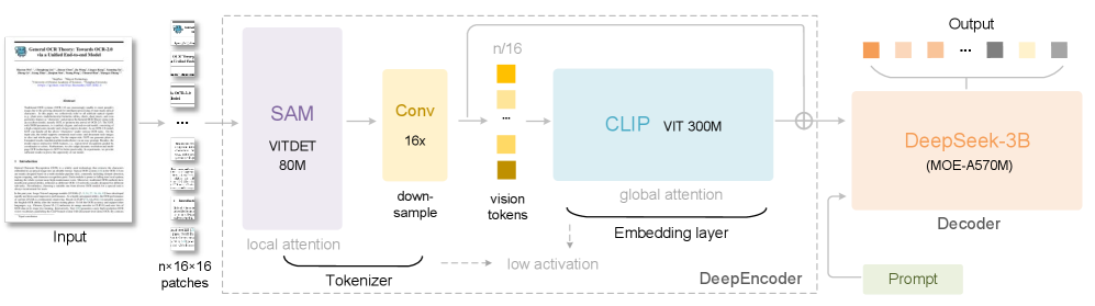 DeepEncoder 是 DeepSeek-OCR 的核心,包含主要三个组件: