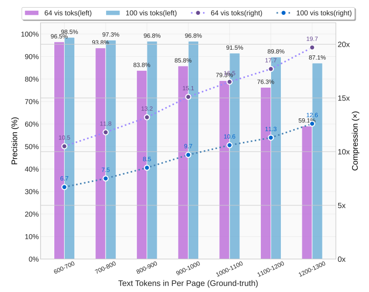 评估视觉 token 相对于文本 token 的压缩率和还原精度