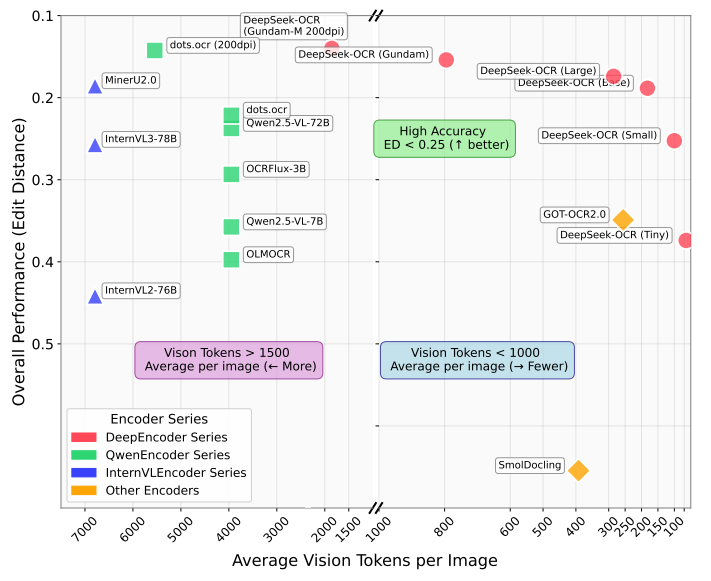 本文借助 DeepSeek-OCR 的研究,对视觉 token 压缩文本的可行性进行了初步研究;DeepSeek-OCR 模型以 DeepEncoder 作为核心组件,实现了高分辨率输入下的低激活开销,确保视觉 token 的数量保持着合理范围;MoE 解码器将DeepEncoder 编码压缩后的信息进行原始文本表示的还原,验证了视觉 token 相对传统文本 token 的信息优势