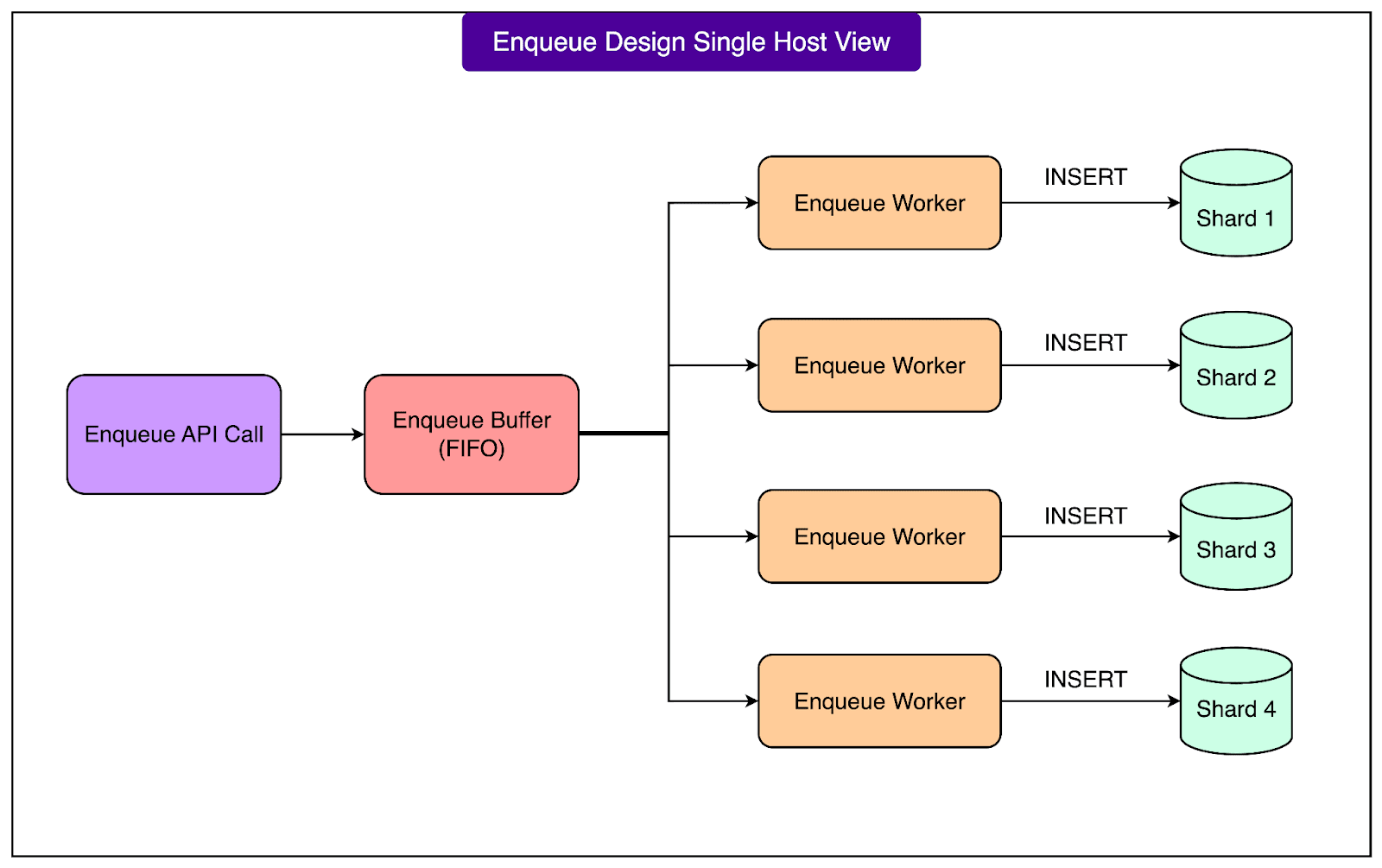 When a client wants to add a new task, it sends an Enqueue request to the appropriate FOQS host. Instead of immediately writing this item to the database, the host first places the request into an in-memory buffer. This approach allows FOQS to batch multiple enqueues together for each shard, which is much more efficient than inserting them one by one. As soon as the request is accepted into the buffer, the client receives a promise that the enqueue operation will be processed shortly.