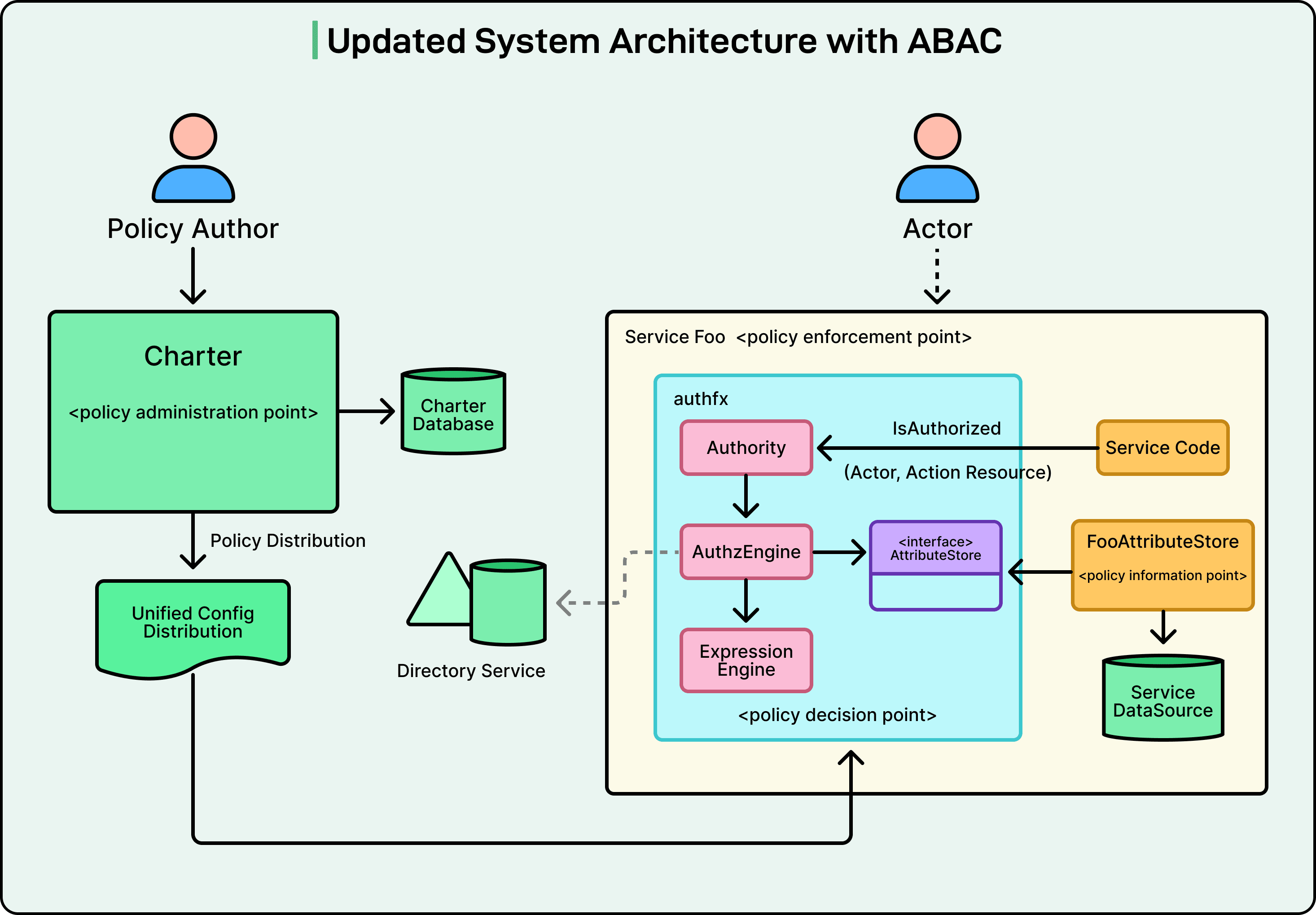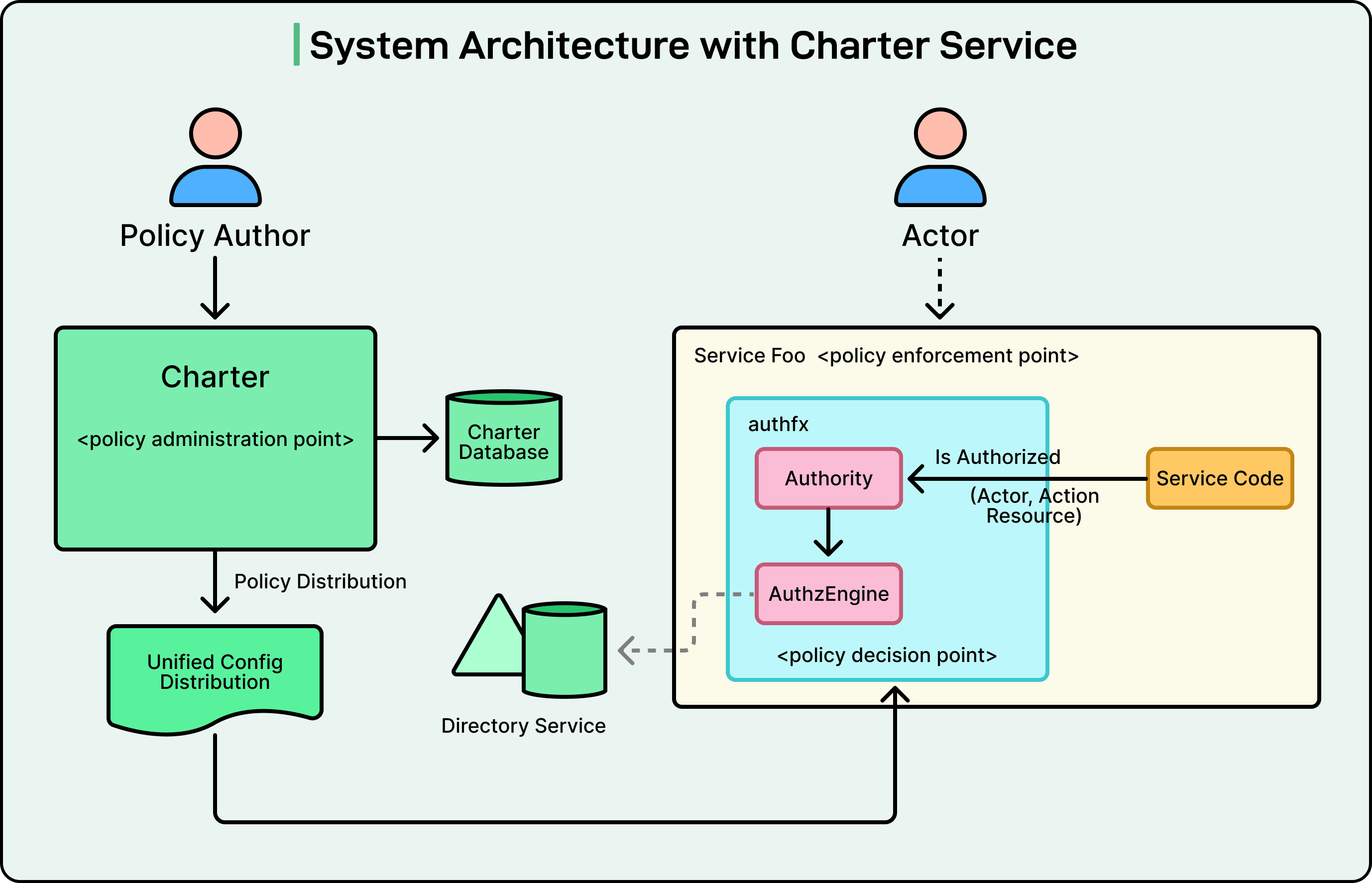 Policies stored in Charter are distributed to individual services. Each service includes a local library called authfx that evaluates these policies.