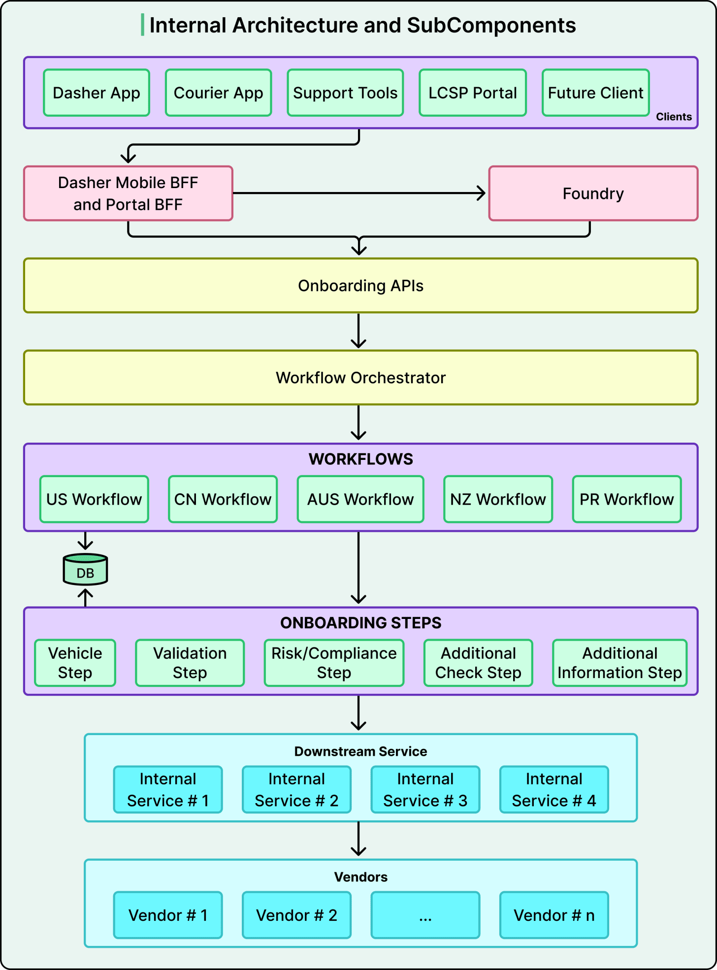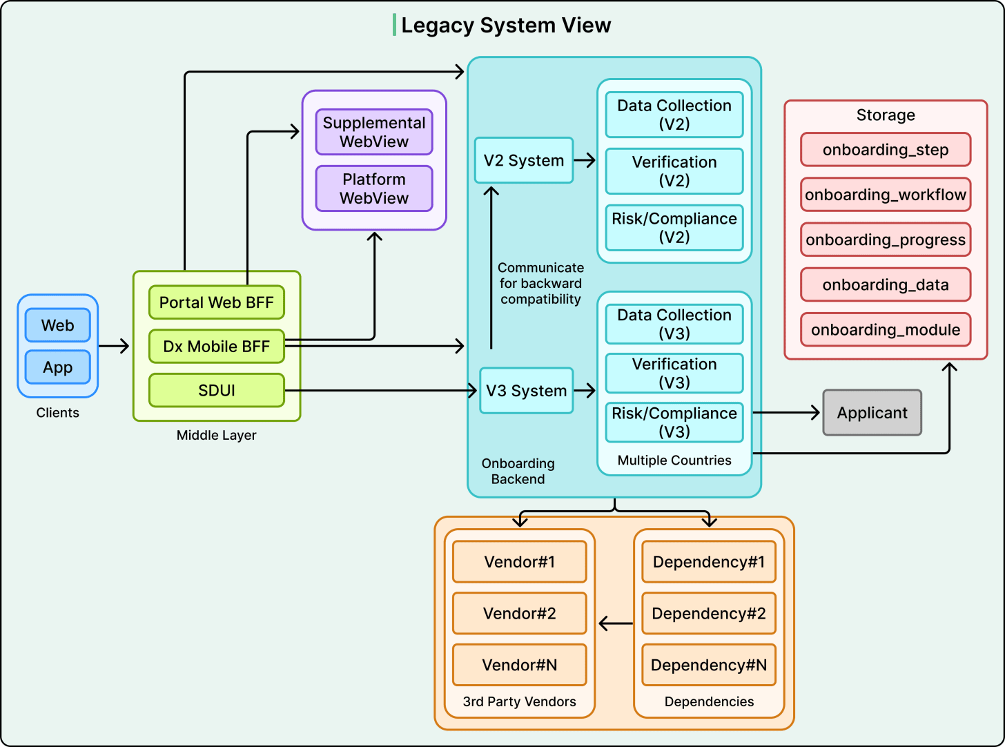 Vendor integrations followed no consistent pattern either. Some onboarding steps used internal services, which called third-party vendors. Other steps called vendors directly. This inconsistent layering made testing and debugging unpredictable.