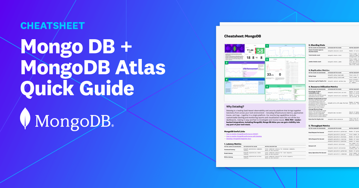 Skip the guesswork with this MongoDB cheatsheet from Datadog. You’ll get a quick, practical reference for monitoring performance and diagnosing issues in real systems.