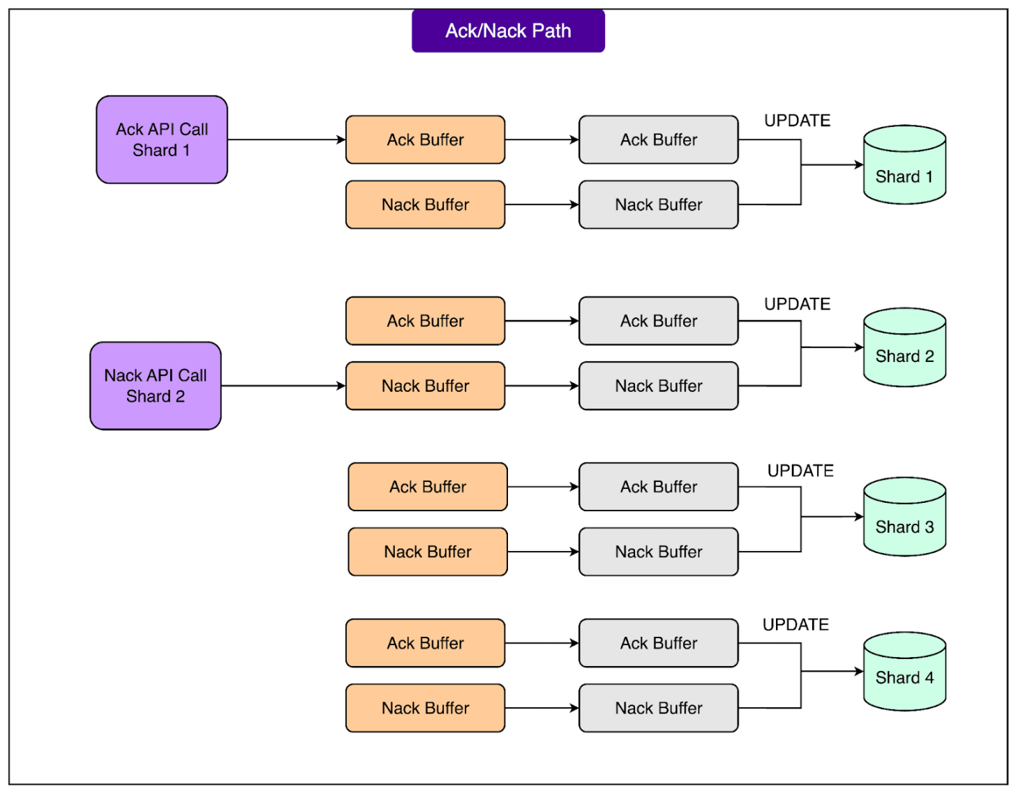 When the FOQS host receives an ack or nack request, it does not immediately write to the database. Instead, it appends the request to an in-memory buffer that is maintained per shard. This buffering is similar to what happens during the enqueue path. By batching multiple ack and nack operations together, FOQS can apply them to the database more efficiently, reducing write overhead and improving overall throughput. See the diagram below:
