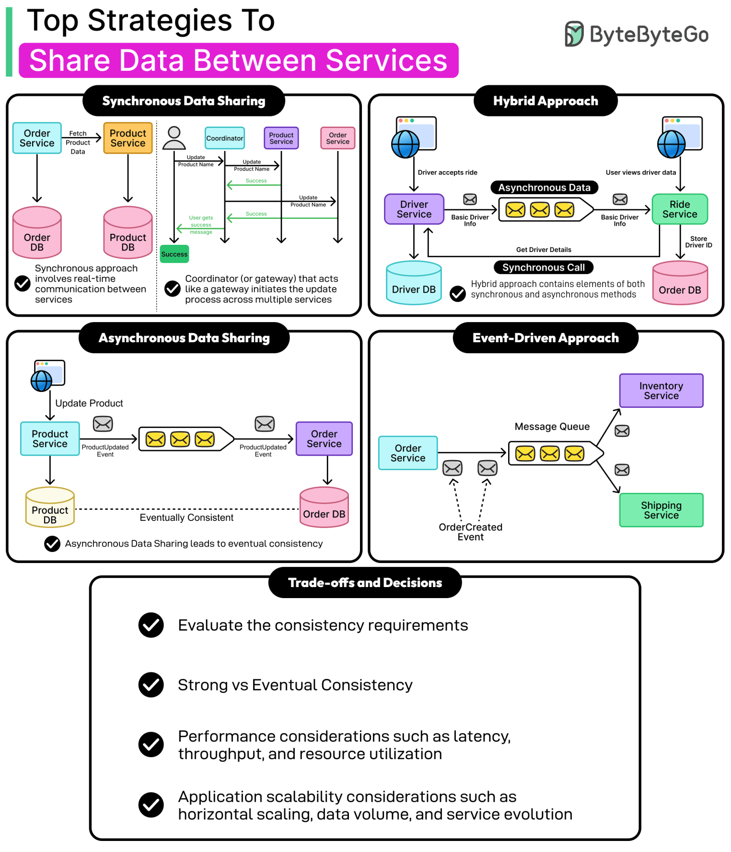 In this article, we explore these questions in depth. We investigate the difference between sharing a data source and sharing data, and examine the main strategies used to share data between services.