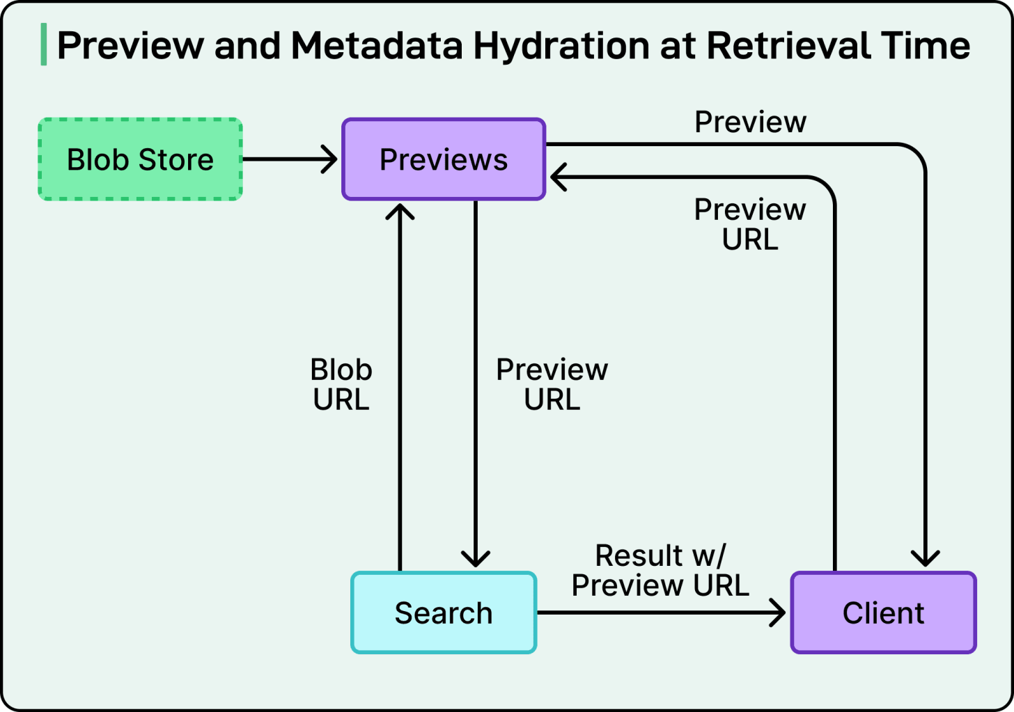 Instead, when a search returns results, the system generates preview URLs that the frontend can fetch. These URLs point to a preview service built on top of Riviera that generates thumbnails and previews in multiple resolutions on the fly. To avoid repeatedly generating the same preview, the system caches them for 30 days, striking a balance between storage costs and performance.