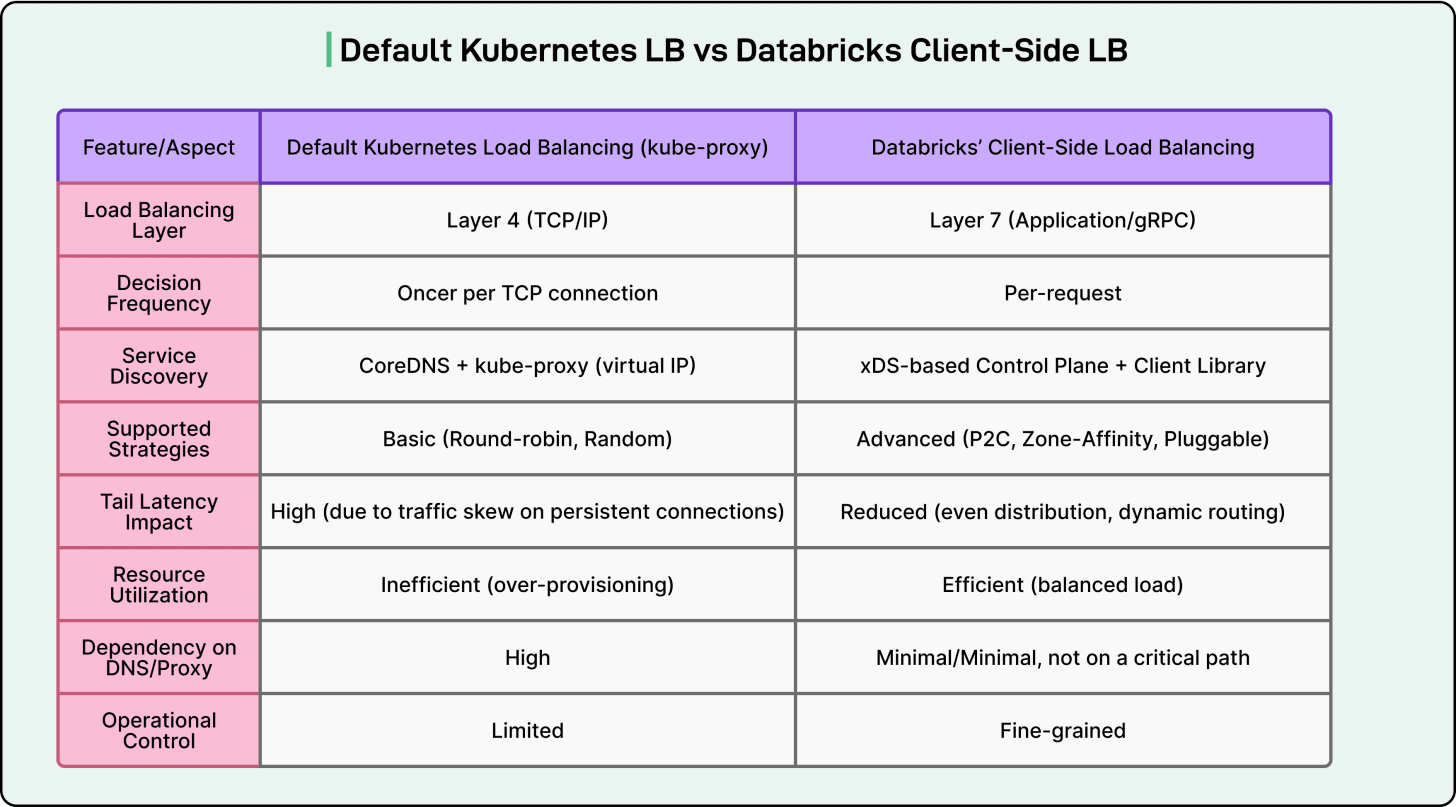 Here’s a table that shows the difference between the default Kubernetes LB and Databricks client-side LB: